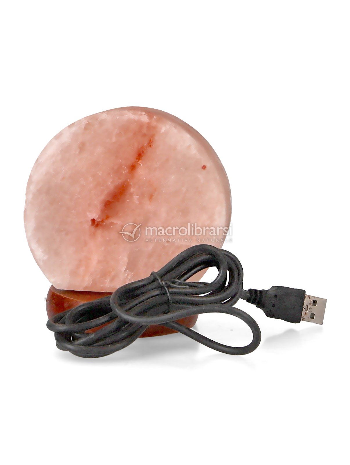 Piccola lampada di sale con cavo USB e intaglio in legno con simbolo OM.