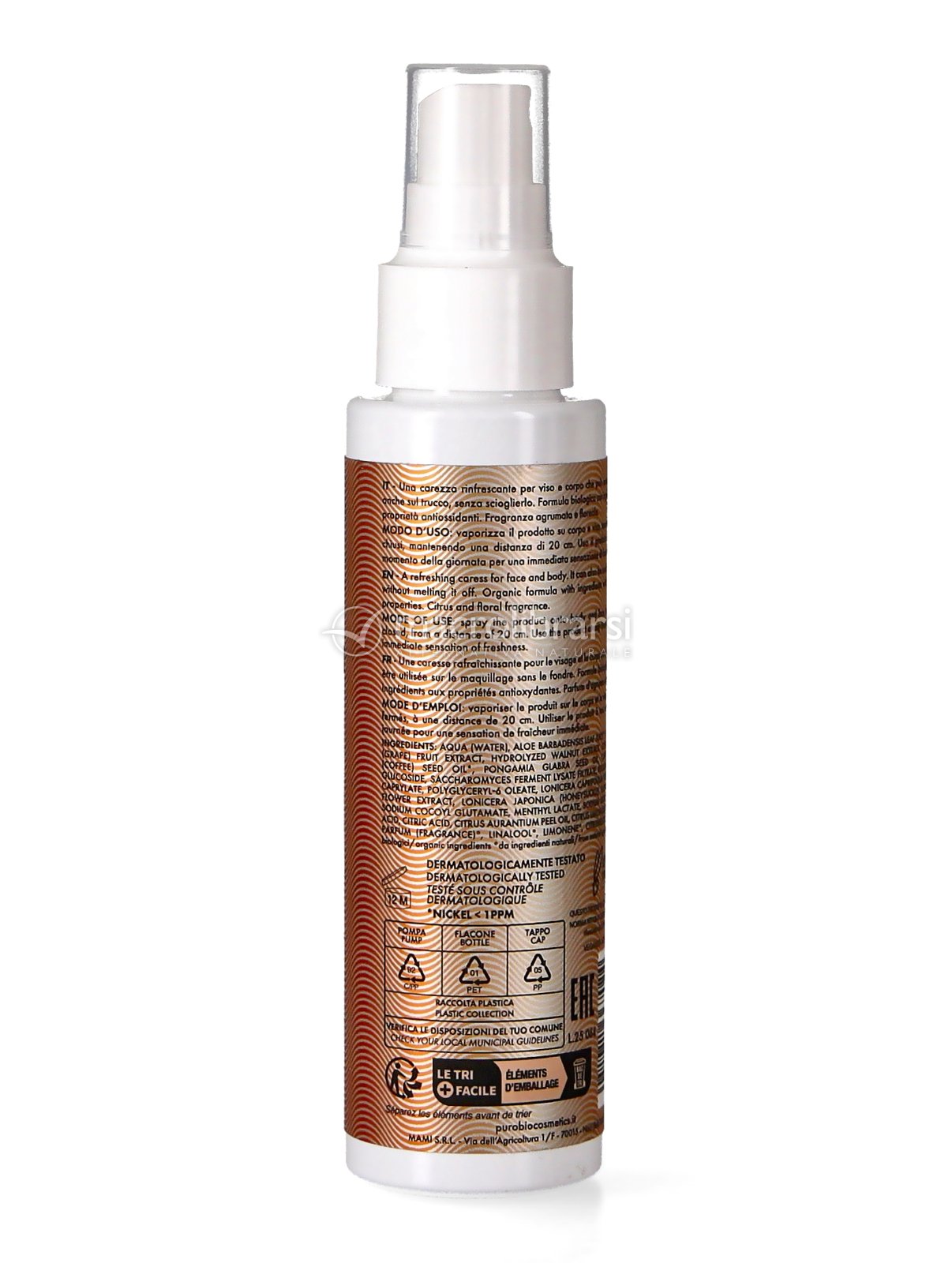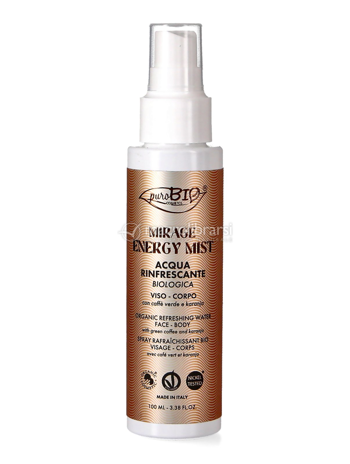 Il pratico erogatore spray di Mirage Energy Mist di PuroBIO nebulizza una nebbia finissima molto rinfrescante senza bagnare la pelle, risultando adatta non solo per viso e corpo, ma anche per essere utilizzata sopra il make-up senza scioglierlo.