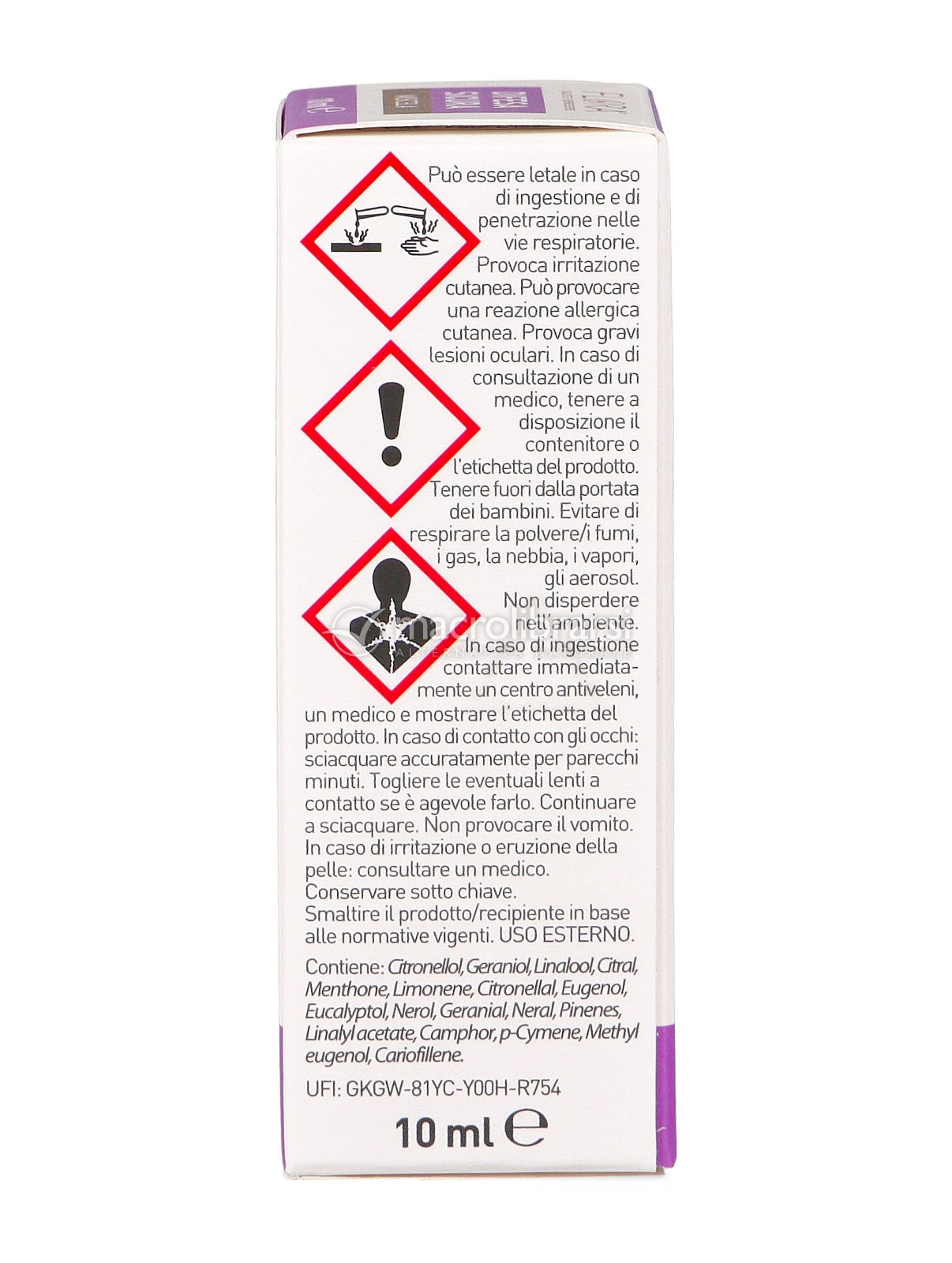 | Avvertenze | Può essere letale in caso di ingestione e di penetrazione nelle vie respiratorie. Provoca irritazione cutanea. Può provocare una reazione allergica cutanea. Provoca gravi lesioni oculari. In caso di consultazione di un medico, tenere a disposizione il contenitore o l'etichetta del prodotto. Tenere fuori dalla portata dei bambini. Evitare di respirare la polvere/i fumi, i gas, la nebbia, i vapori, gli aerosol. Non disperdere nell'ambiente. In caso di ingestione contattare immediatamente un centro antiveleni, un medico e mostrare l'etichetta del prodotto. In caso di contatto con gli occhi: sciacquare accuratamente per parecchi minuti. Togliere le eventuali lenti a contatto se è agevole farlo. Continuare a sciacquare. Non provocare il vomito. In caso di irritazione o eruzione della pelle: consultare un medico. Conservare sotto chiave. Smaltire il prodotto/recipiente in base alle normative vigenti. USO ESTERNO. |