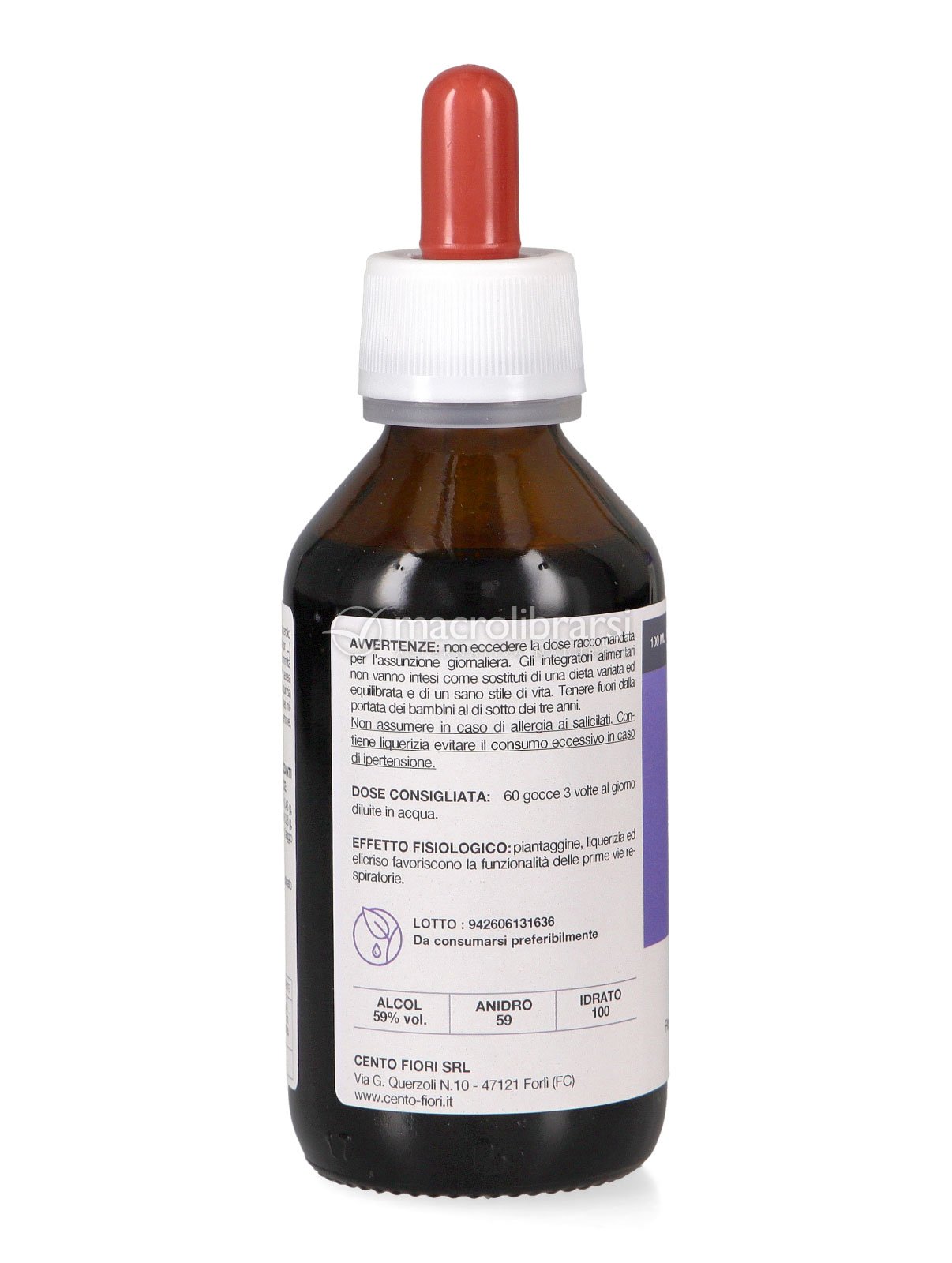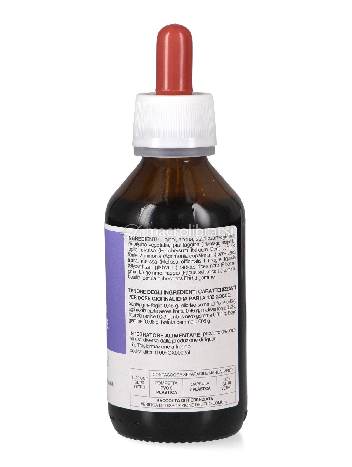 | Disclaimer | Non superare la dose giornaliera consigliata. Gli integratori alimentari non vanno intesi come sostituti di una dieta variata ed equilibrata. Tenere fuori dalla portata dei bambini al di sotto dei tre anni. Non utilizzare in gravidanza e nei bambini o comunque per periodi prolungati senza sentire il parere del medico. Conservare in luogo asciutto e lontano da fonti di calore. Richiudere la confezione dopo l'uso. Macrolibrarsi ricorda l'importanza di seguire uno stile di vita sano e un'alimentazione variata ed equilibrata. |