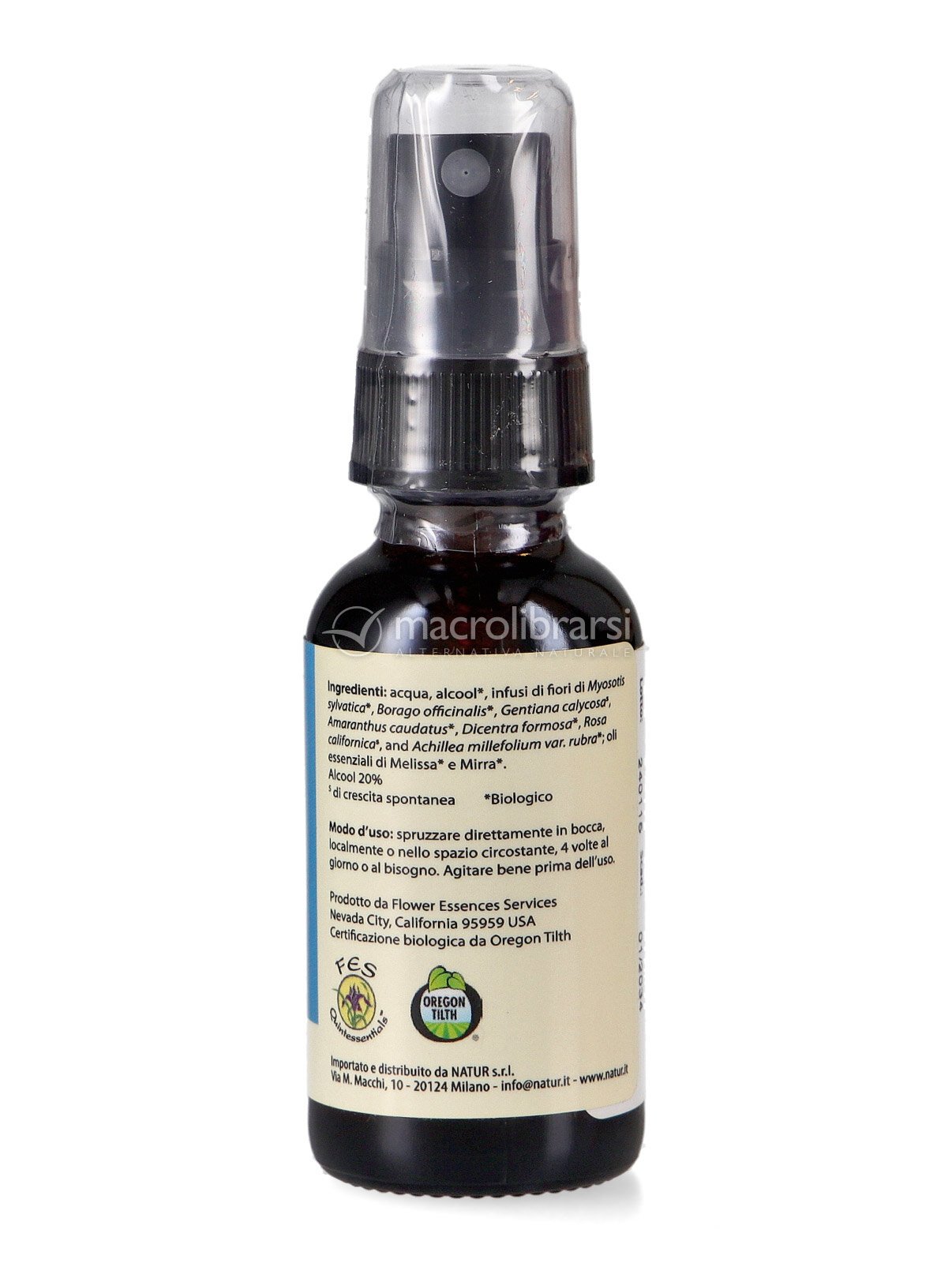 Acqua, alcool*, infusi di fiori di Myosotis sylvatica*, Borago officinalis*, Gentiana calycosa* Amaranthus caudatus*, Dicentra formosa*, rosa californica*, and achillea millefolium var.rubra, oli essenziali di Melissa e Mirra*.* Biologico.