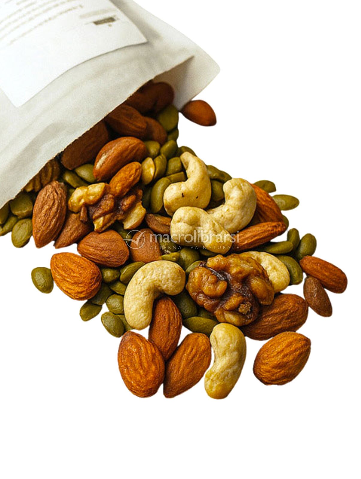 Mix biologico di mandorle, anacardi, noci e semi di zucca, ideale come snack naturale e nutriente.