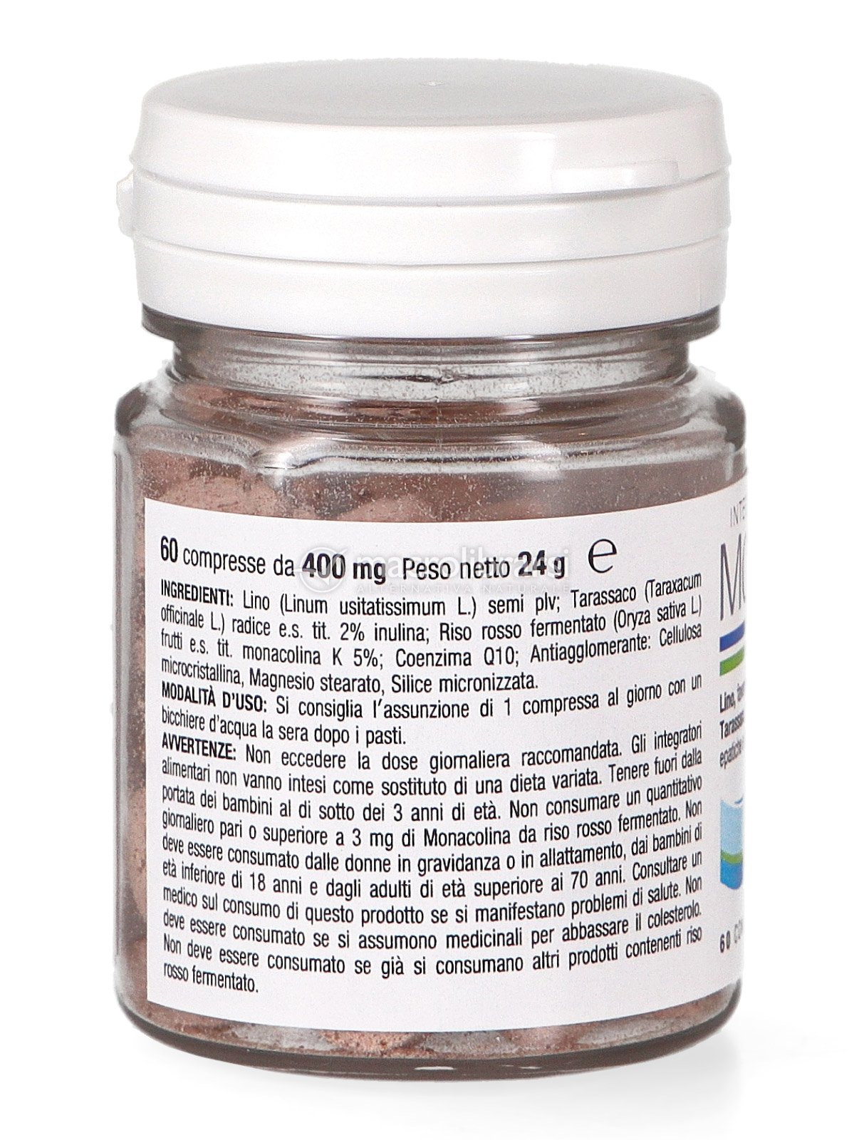 | Avvertenze | Non superare la dose giornaliera consigliata. Gli integratori alimentari non vanno intesi come sostituti di una dieta variata ed equilibrata. Tenere fuori dalla portata dei bambini al di sotto dei tre anni. Non consumare un quantitativo giornaliero superiore o uguale a 3 mg di Monacolina da riso rosso fermentato. Non deve essere consumato dalle donne in gravidanza o in allattamento, dai bambini in età inferiore ai 18 anni e dagli adulti di età superiore ai 70 anni. Consultare un medico sul consumo di questo prodotto se si manifestano problemi di salute. Non deve essere consumato se si assumono medicinali per abbassare il colesterolo. Non deve essere consumato se già si consumano altro prodotti contenenti riso rosso fermentato. |