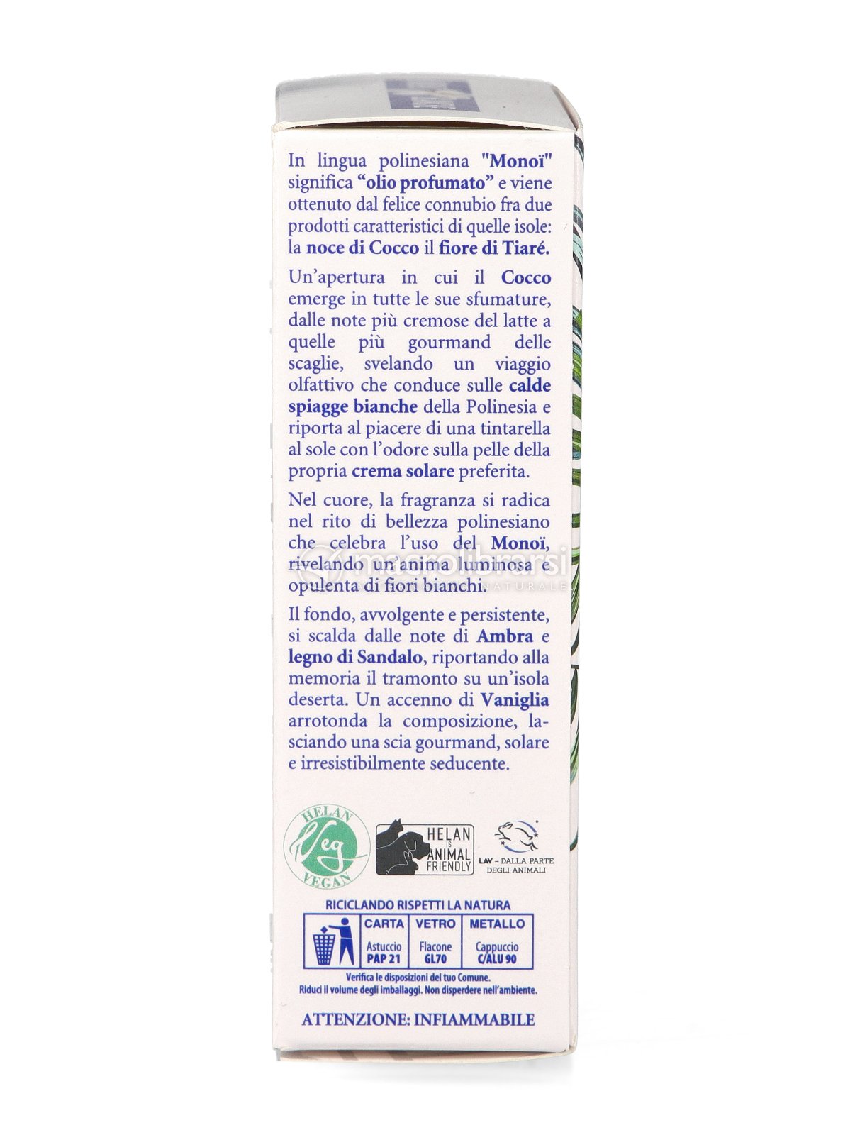 Fragranza vegana, ispirata alla tradizione del Monoi, con una composizione calda e armoniosa.