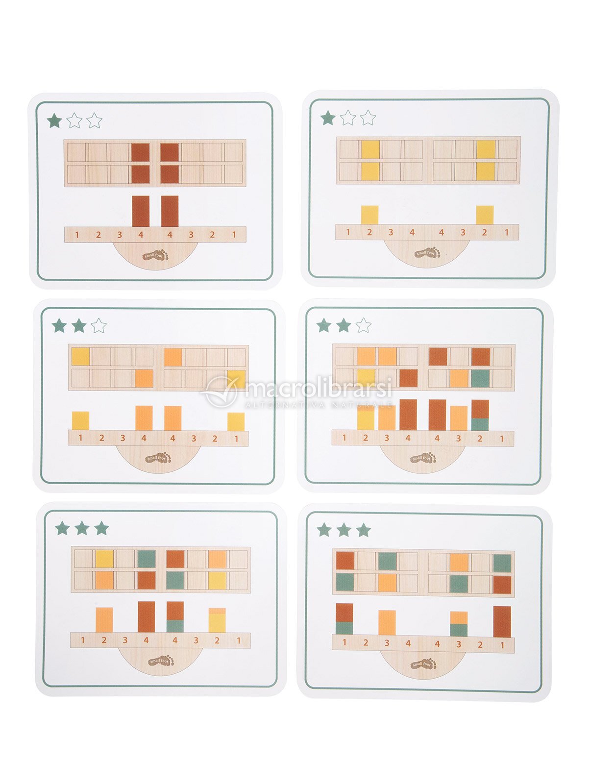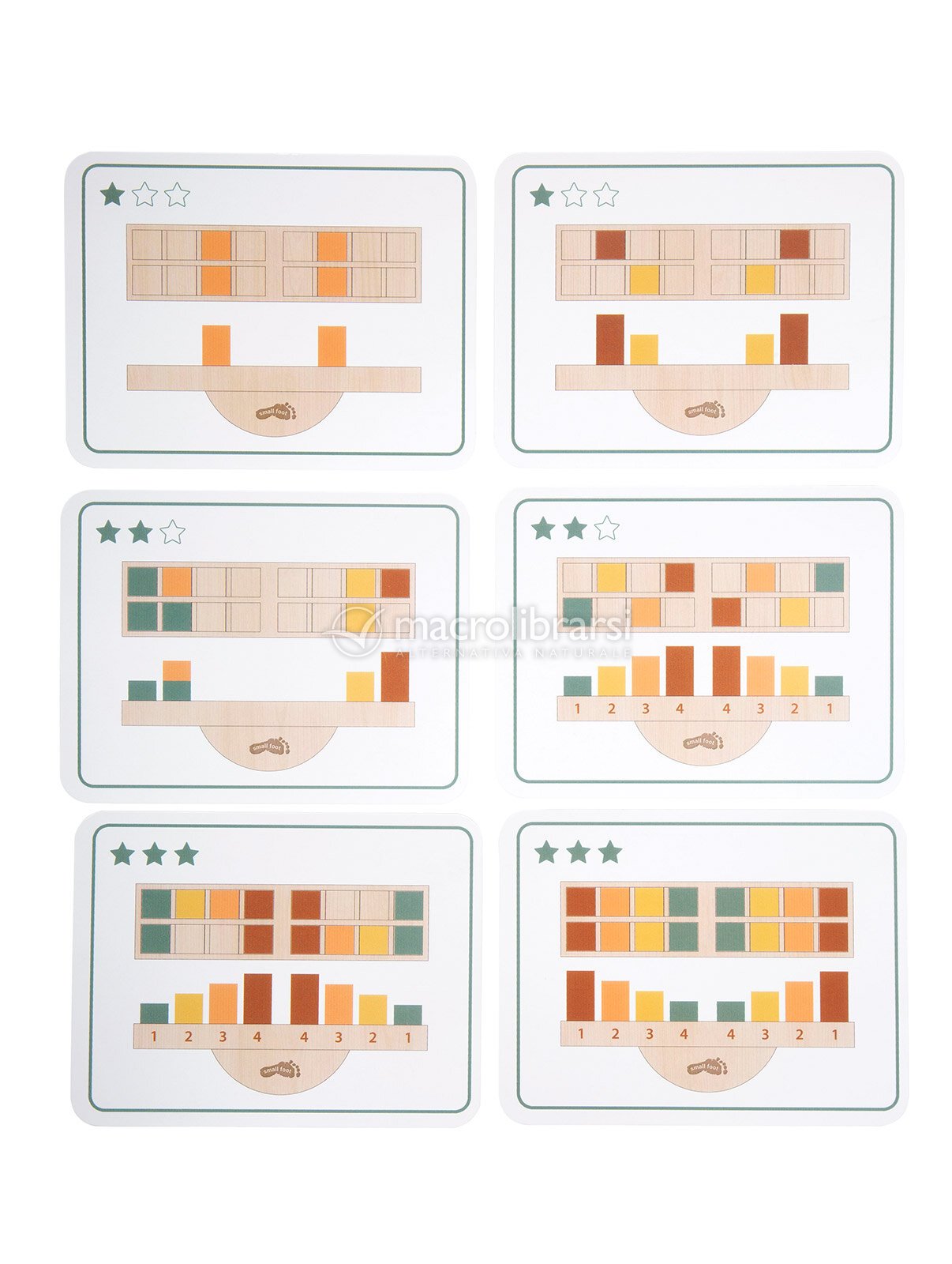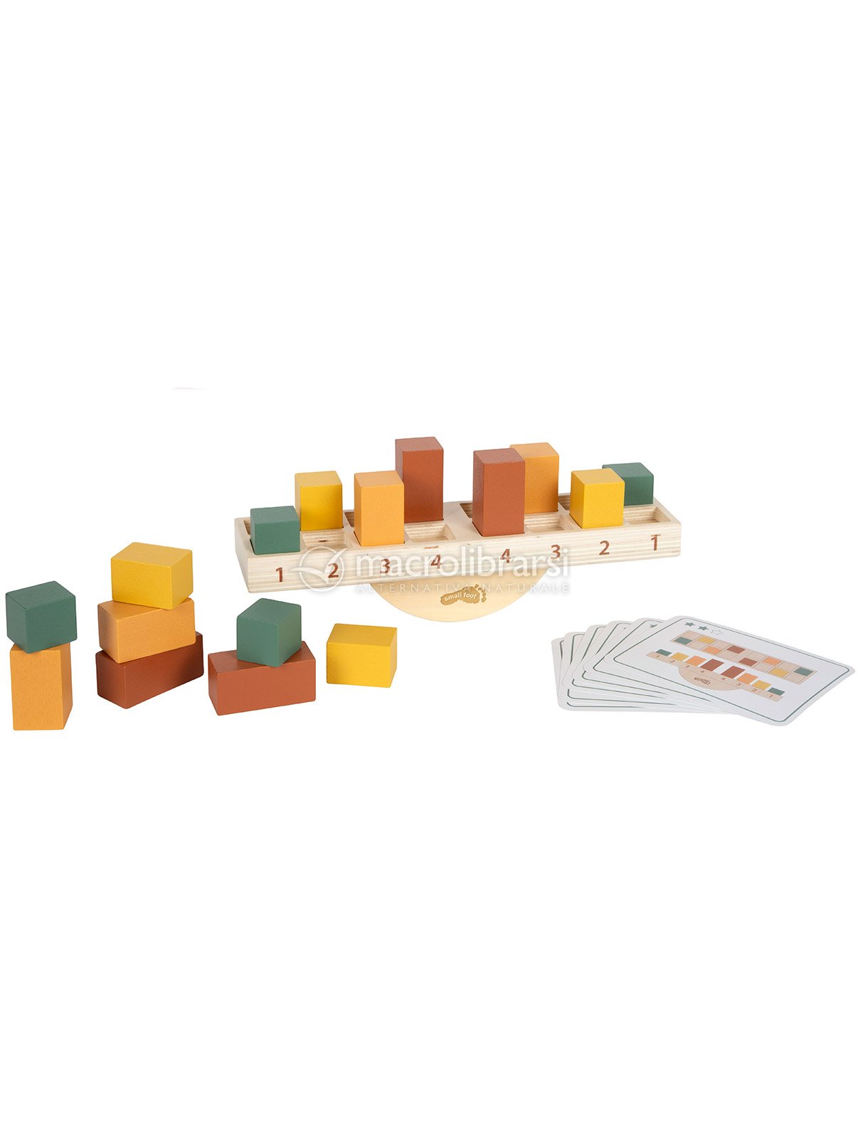 Su una robusta bilancia si posizionano blocchi di legno di altezza e peso diversi, sperimentando le relazioni tra peso, posizione ed equilibrio, in linea con il principio di apprendimento montessoriano, che si basa sulla sperimentazione autonoma.