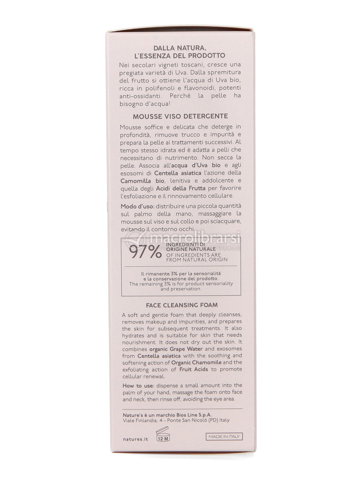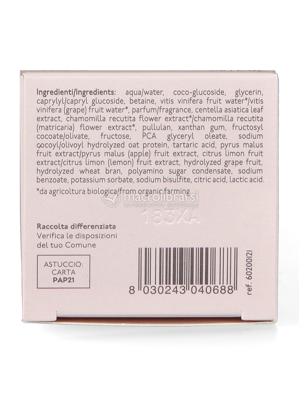 La sua formula associa l'acqua d'Uva Bio e gli esosomi di Centella asiatica all'azione lenitiva e addolcente della Camomilla Bio e a quella esfoliante degli acidi della frutta, che favoriscono il rinnovamento cellulare.