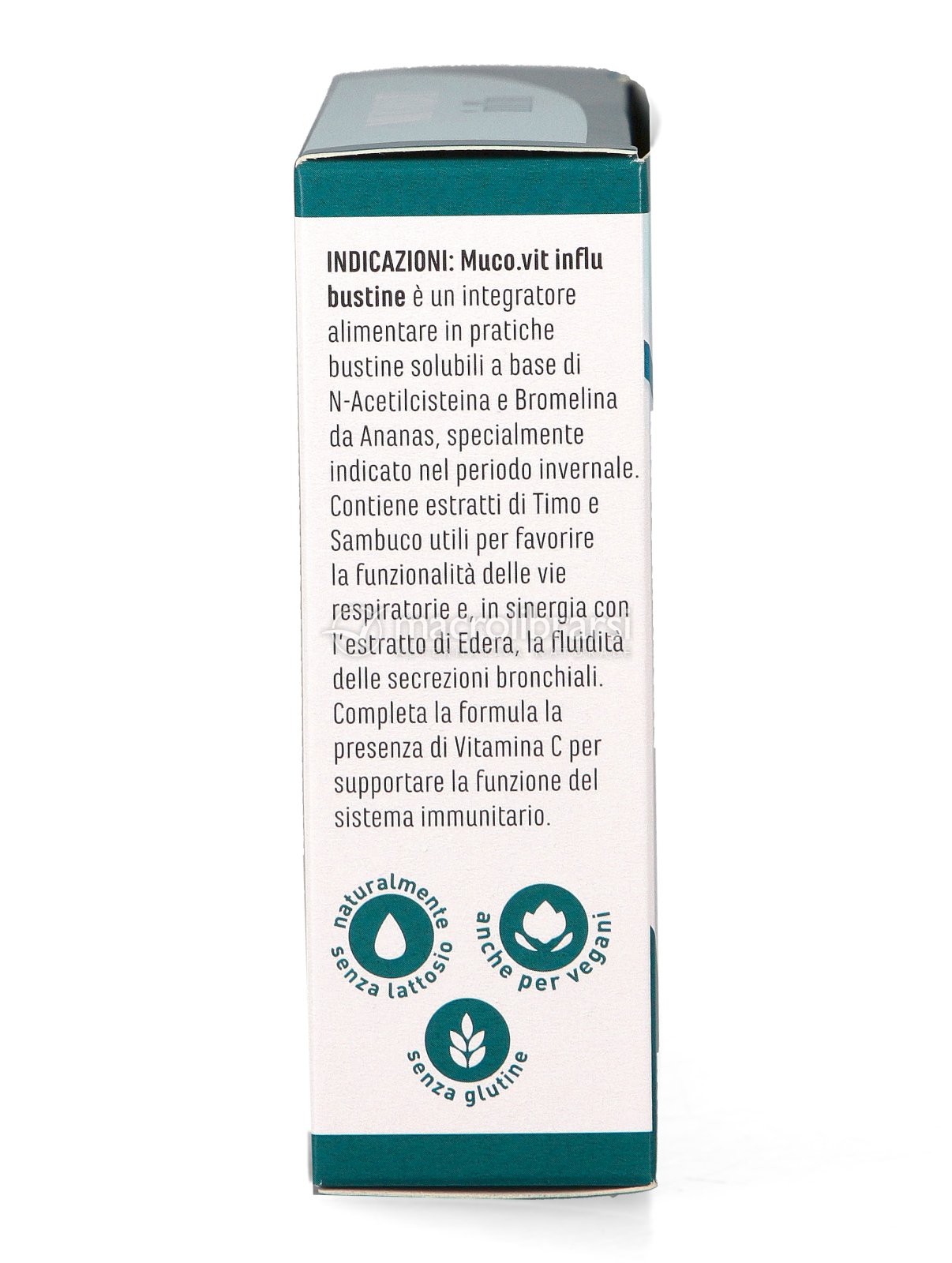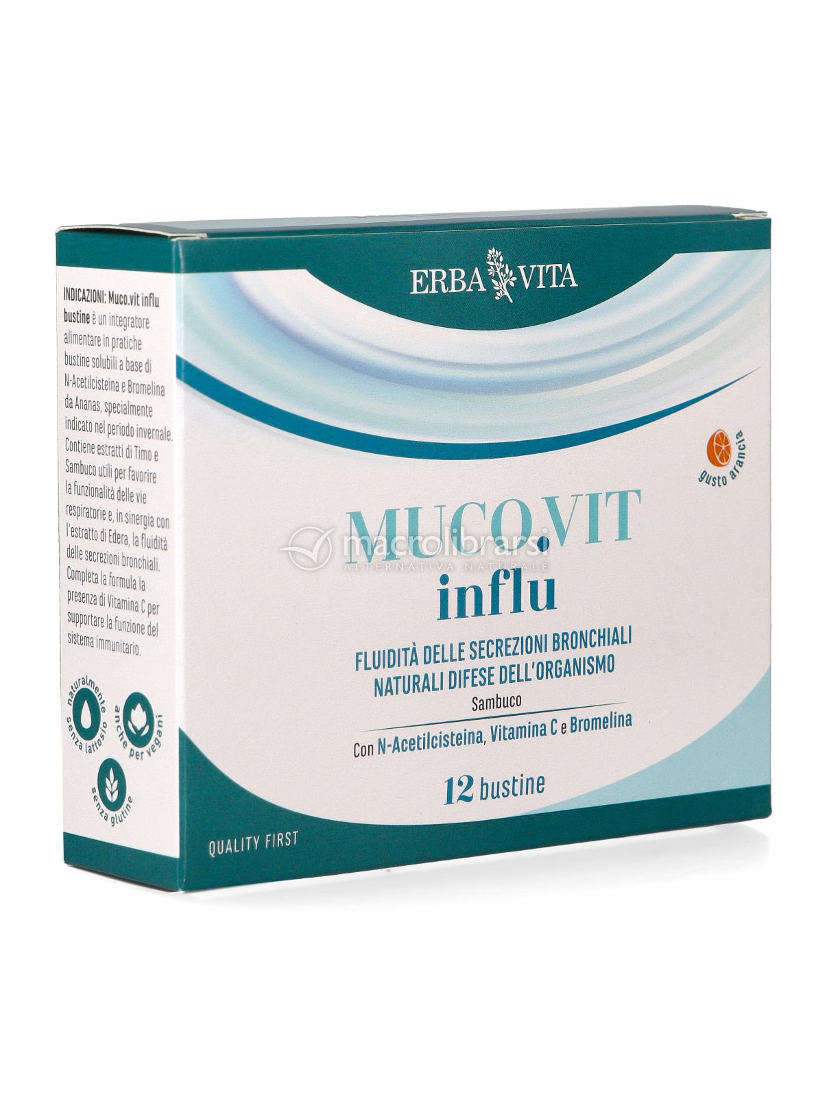 Muco.Vit influ di Erba Vita è un integratore in bustine solubili gusto arancia formulato per supportare la funzionalità delle tue vie respiratorie e del sistema immunitario, specialmente durante il periodo invernale. Contiene: