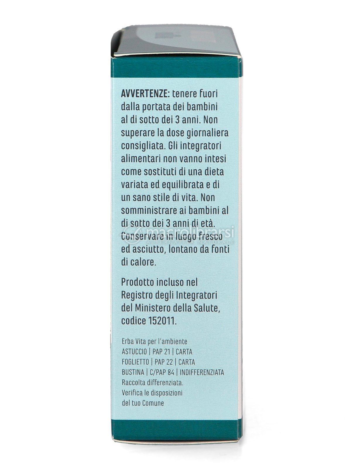 Avvertenze | Non eccedere la dose giornaliera consigliata. Tenere fuori dalla portata dei bambini di età inferiore ai 3 anni. Gli integratori alimentari non vanno intesi come sostituti di una dieta variata e di uno stile di vita sano. Non somministrare ai bambini al di sotto dei 3 anni di età. |