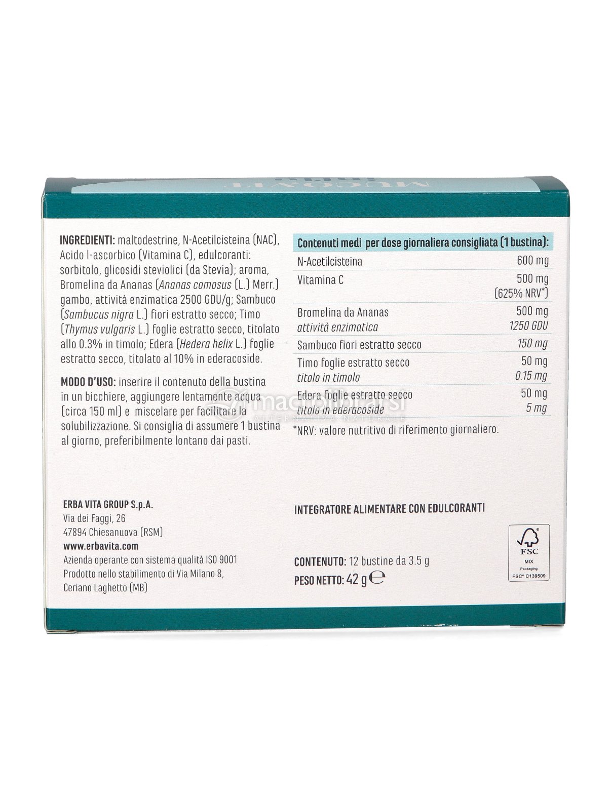 Inoltre, grazie alla sinergia di N-acetilcisteina e Bromelina da Ananas, aiuta a fluidificare il muco, facilitandone l'eliminazione.