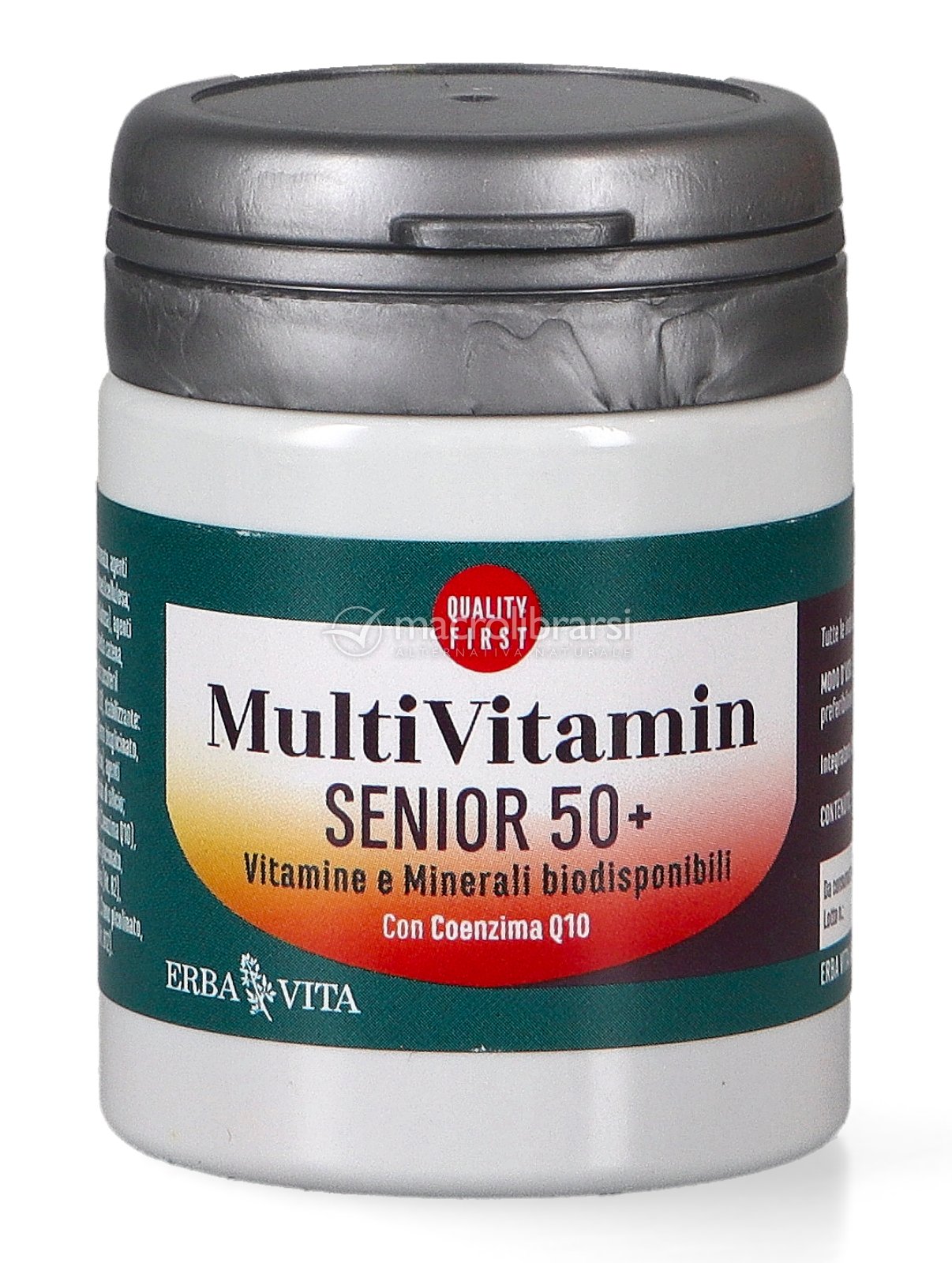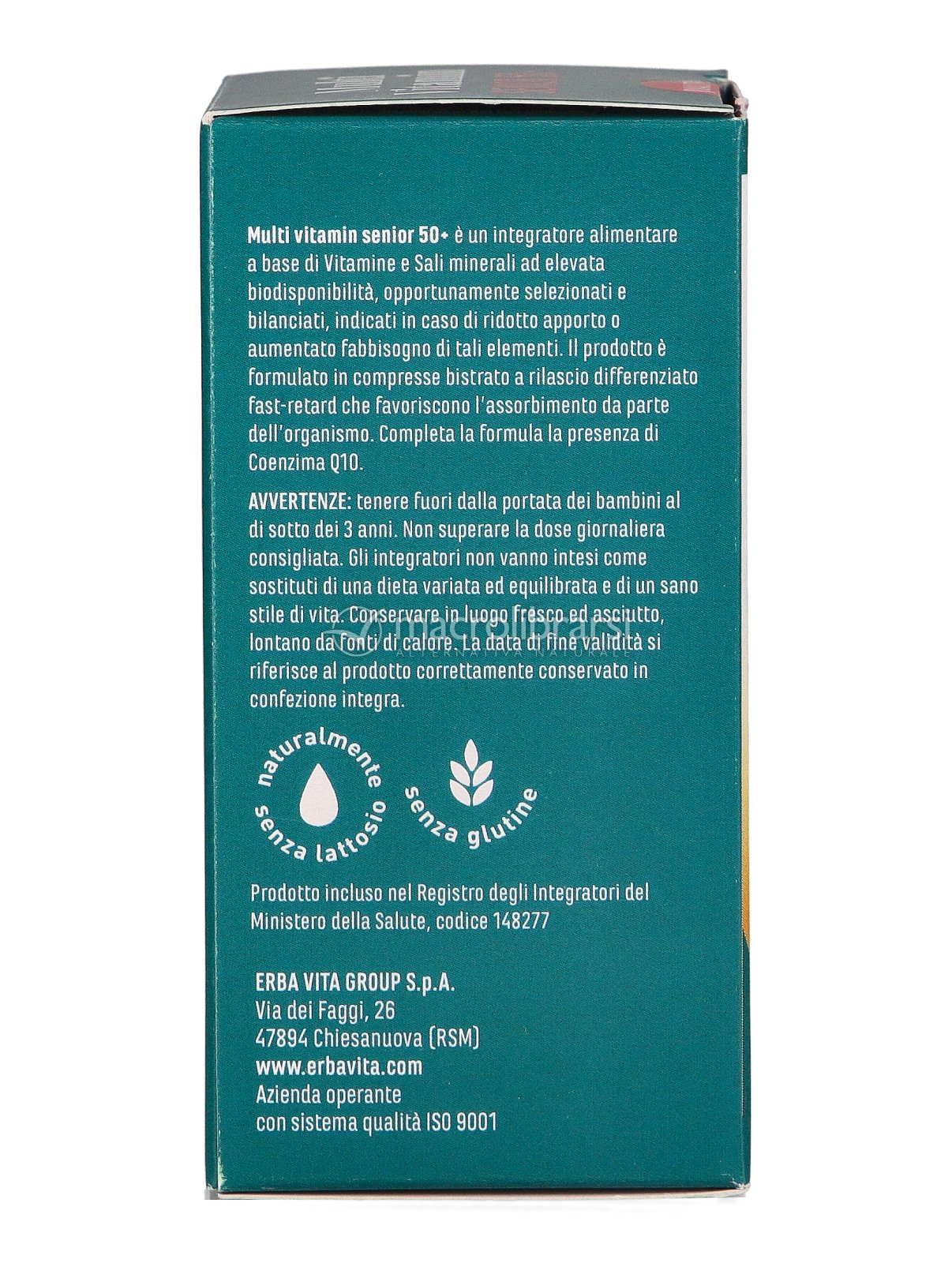 Multi Vitamin Senior 50+ è un integratore alimentare a base di una combinazione di vitamine liposolubili e idrosolubili, minerali specifici tra cui ferro e magnesio, pensati per offrire energia e benessere in età senile.