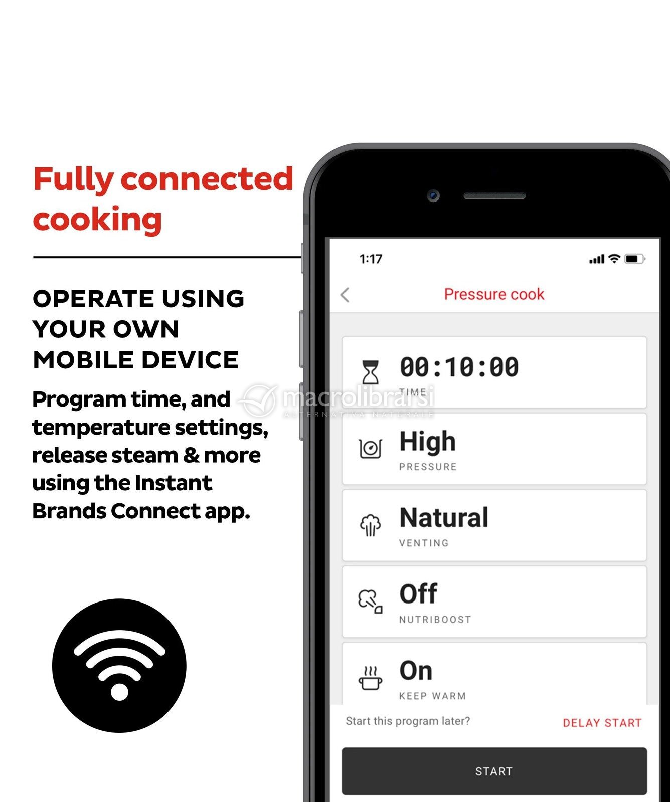Grazie alla connessione Wi-Fi integrata, puoi controllare la cottura da remoto tramite l’app Instant Brands Connect, disponibile per iOS e Android. Imposta tempi, modalità e ricette direttamente dal tuo smartphone e scopri oltre 800 ricette guidate sempre a portata di mano.