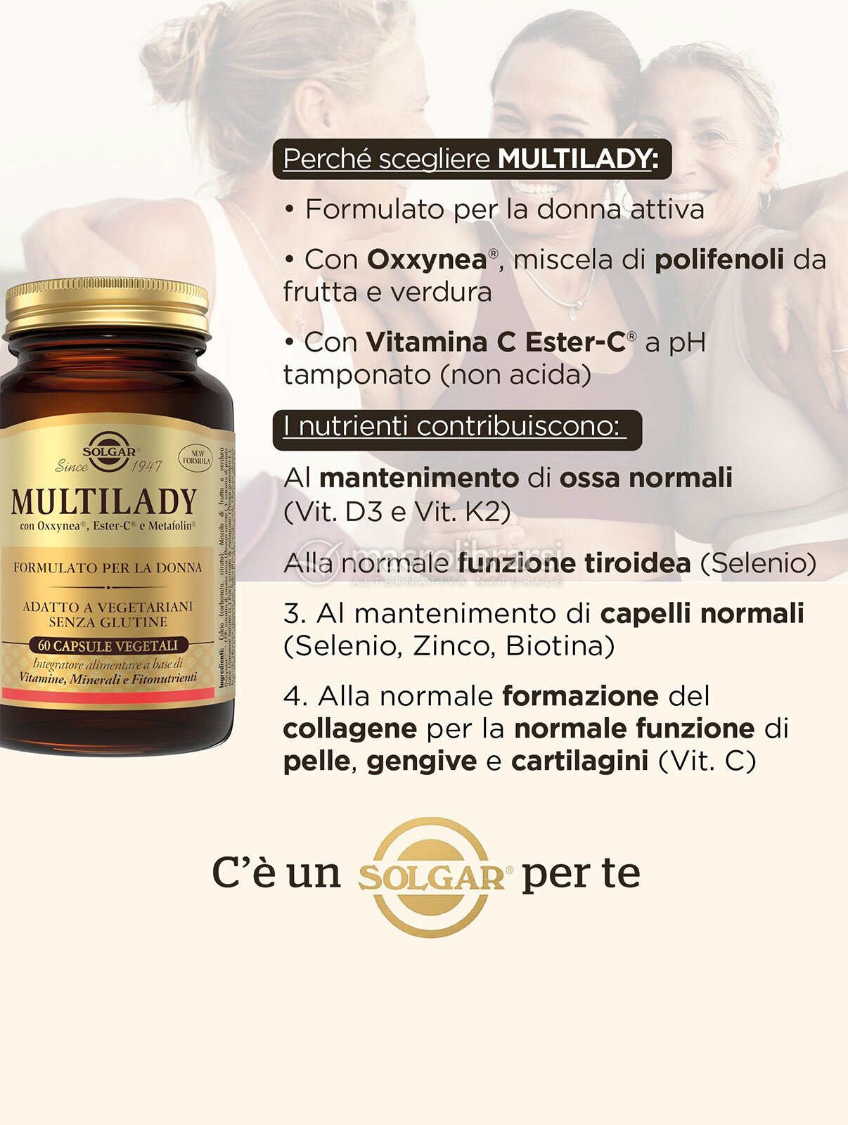 MULTILADY è un integratore alimentare a base di vitamine, minerali e fitonutrienti, formulato per le esigenze femminili.