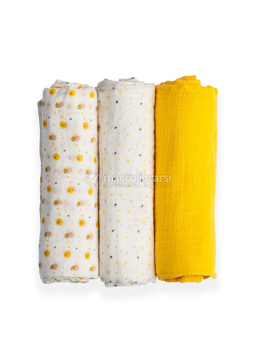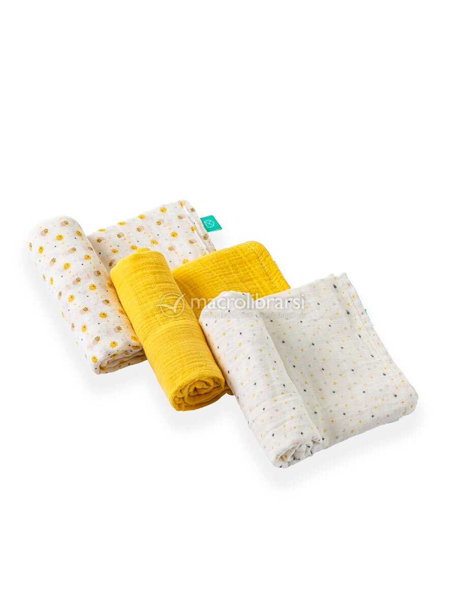 3 teli in mussola di cotone da 80x80 cm con fantasie nella tonalità del giallo, pensati per accompagnarti in ogni momento della giornata.