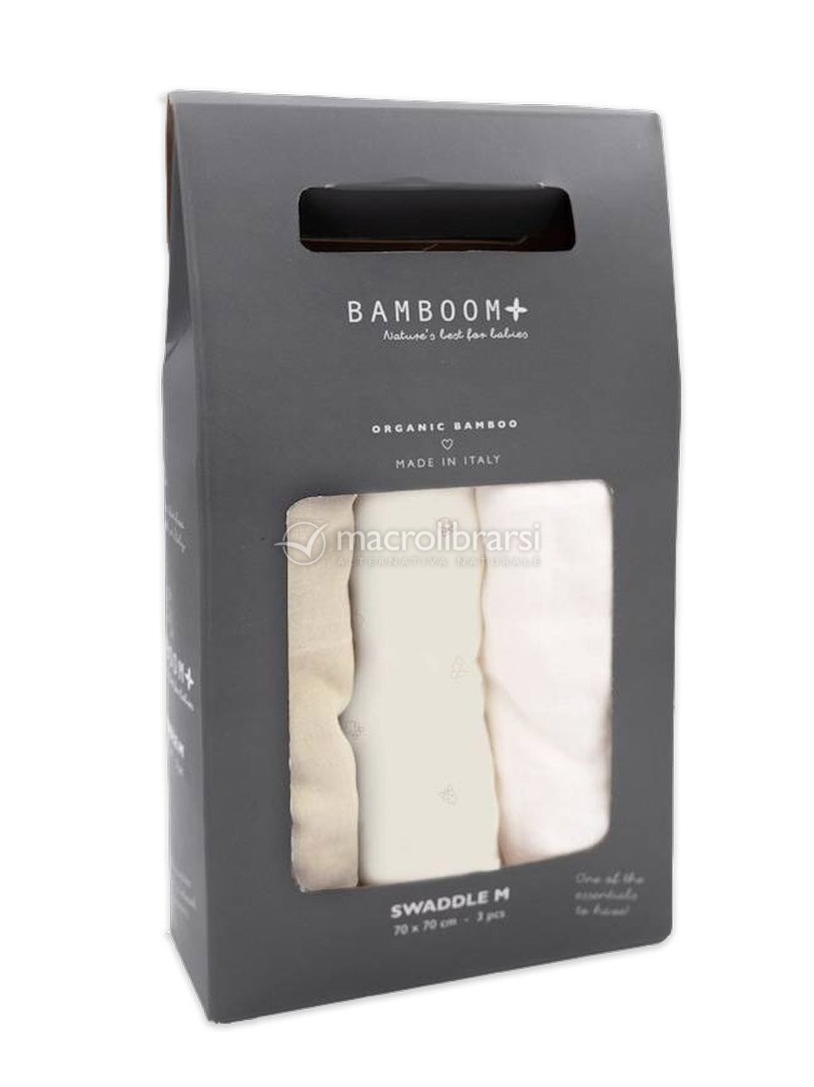 Confezione da 3 soffici mussole multiuso da 70x70 cm, proposte da Bamboom, un'azienda italiana che seleziona materiali ecologici con estrema attenzione e un occhio di riguardo allo stile e al design.