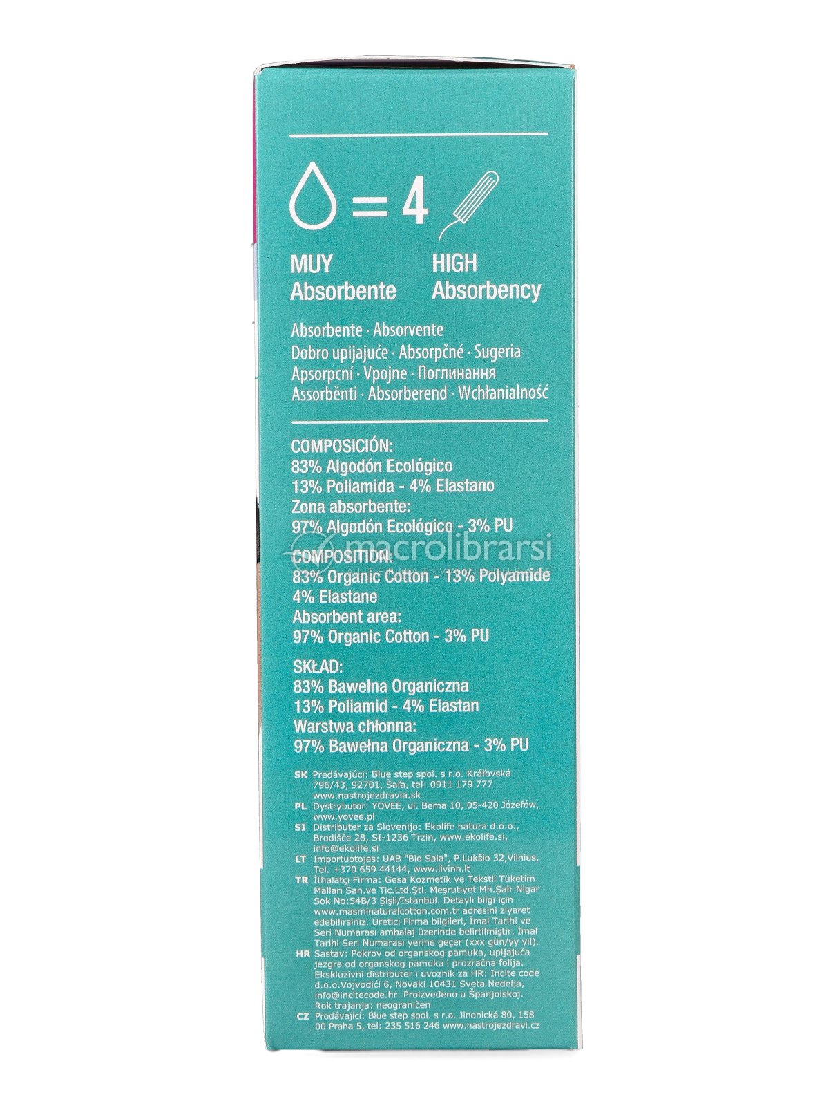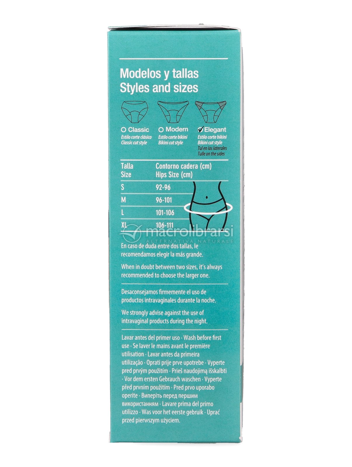 Il taglio bikini con inserto in rete è particolarmente elegante e allo stesso tempo offre una protezione sicura dalle perdite e contiene l'equivalente di 4 assorbenti.