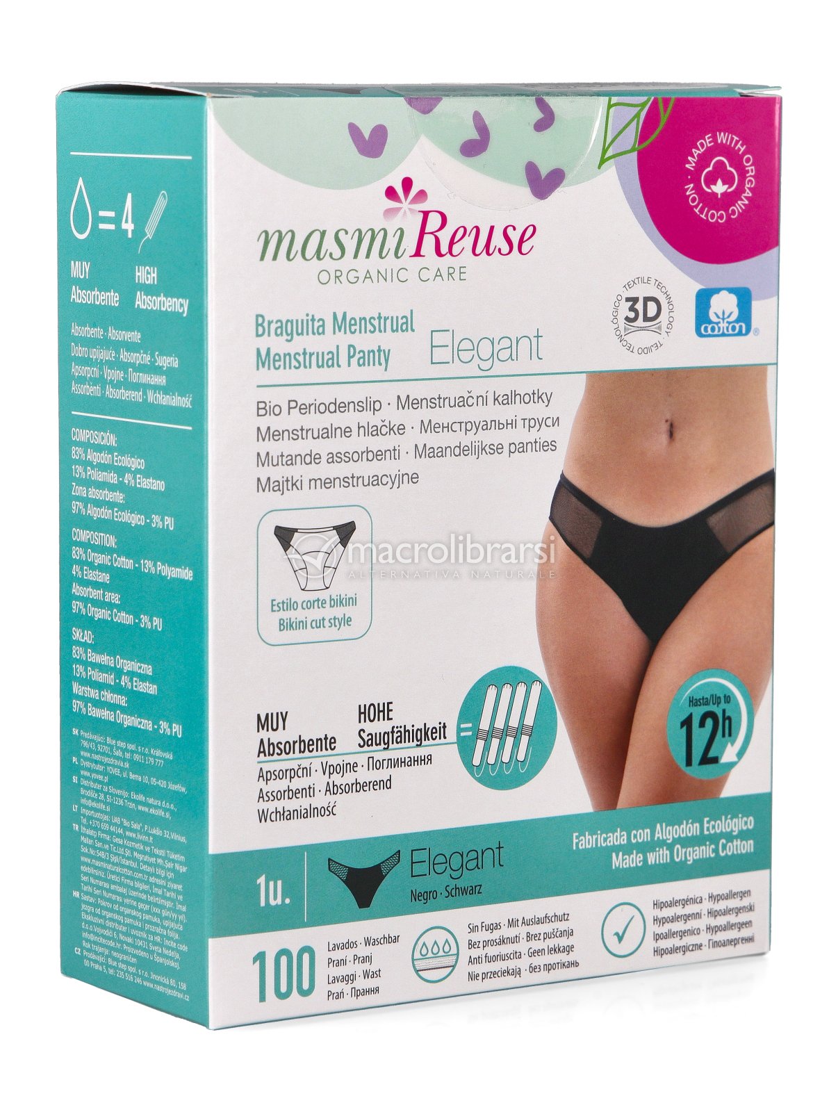 Mutandine mestruali taglio bikini realizzate in cotone organico e ipoallergenico, super assorbenti e anti-fuoriuscita.