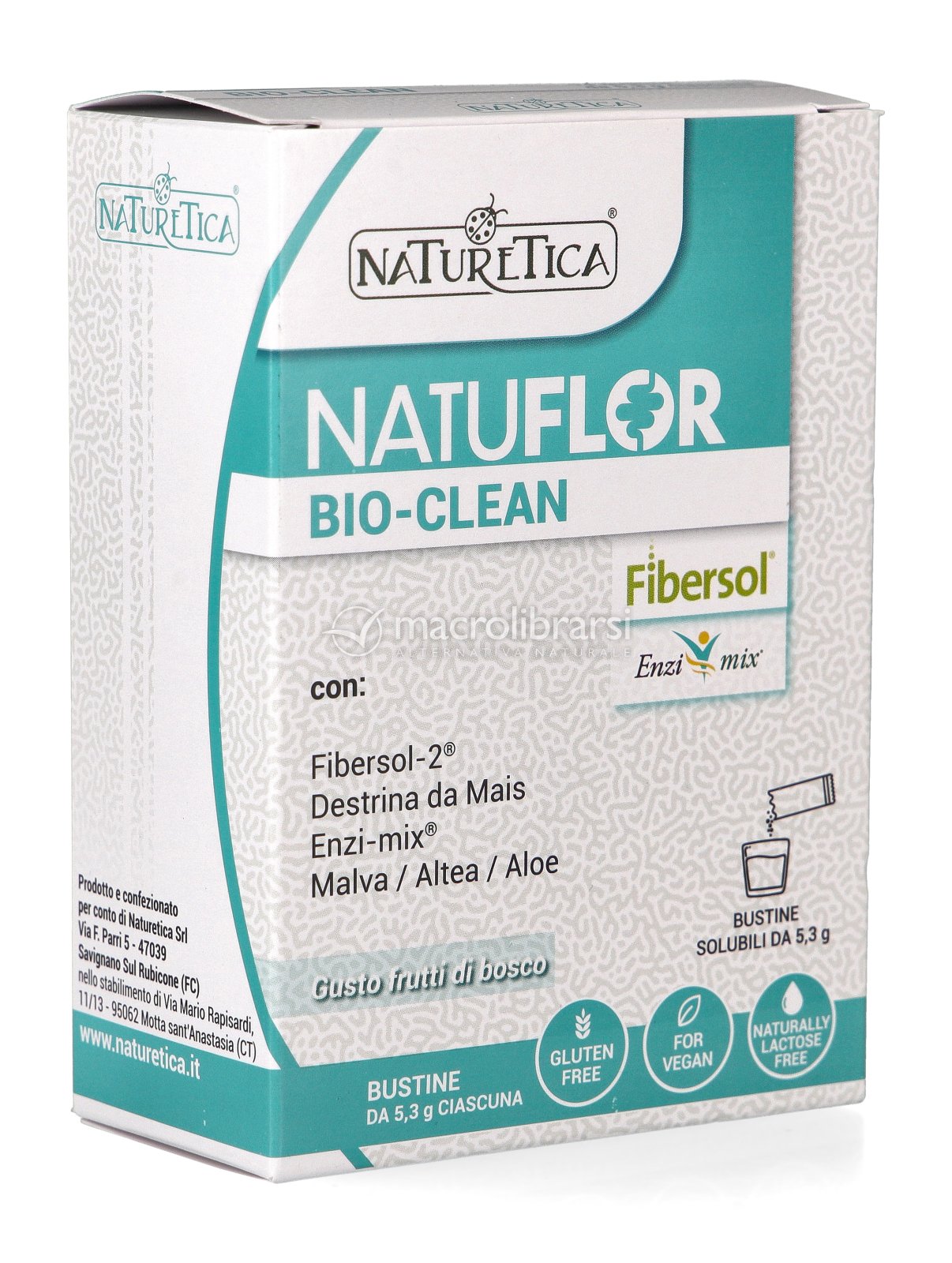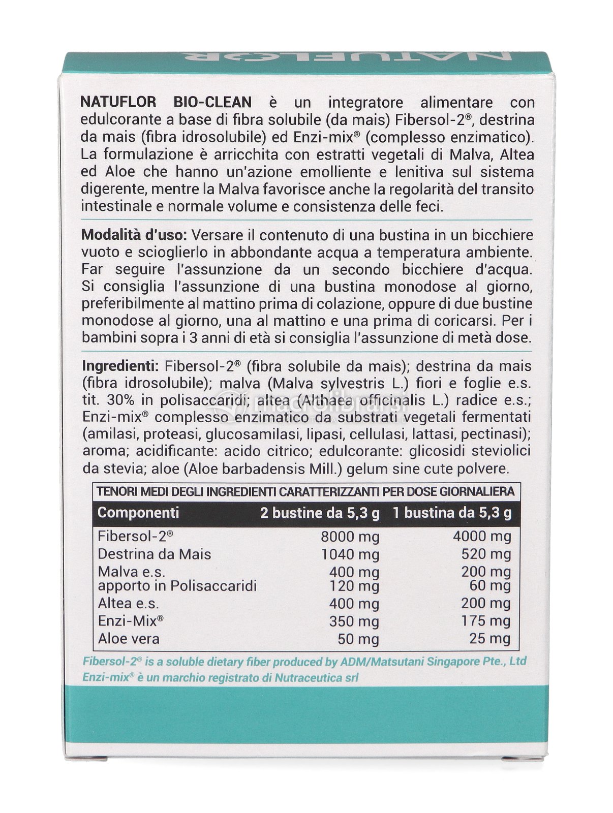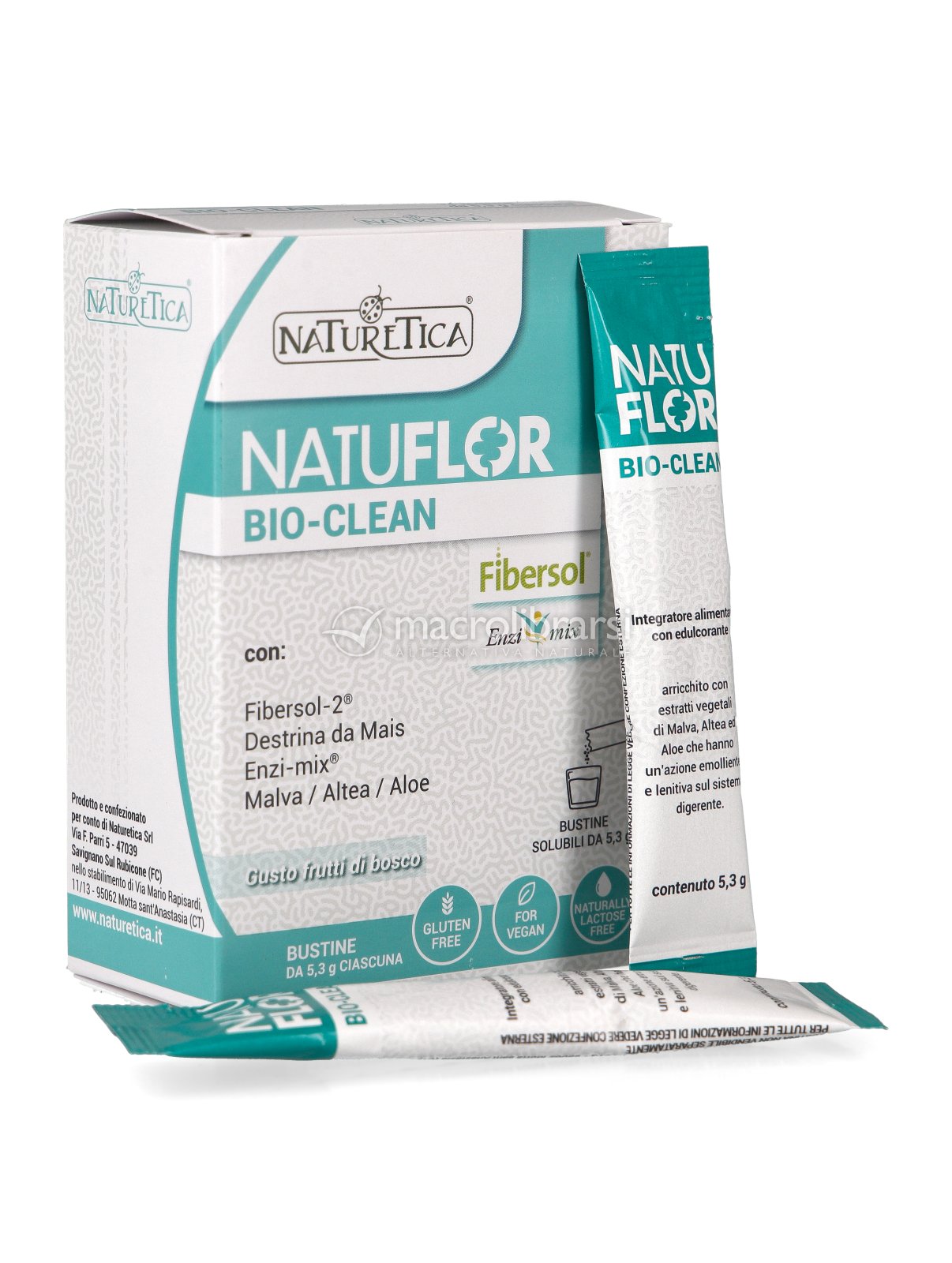 Natuflor Bio-Clea è un integratore alimentare in bustine monodose, al gusto frutti di bosco e dolcificato con edulcorante.