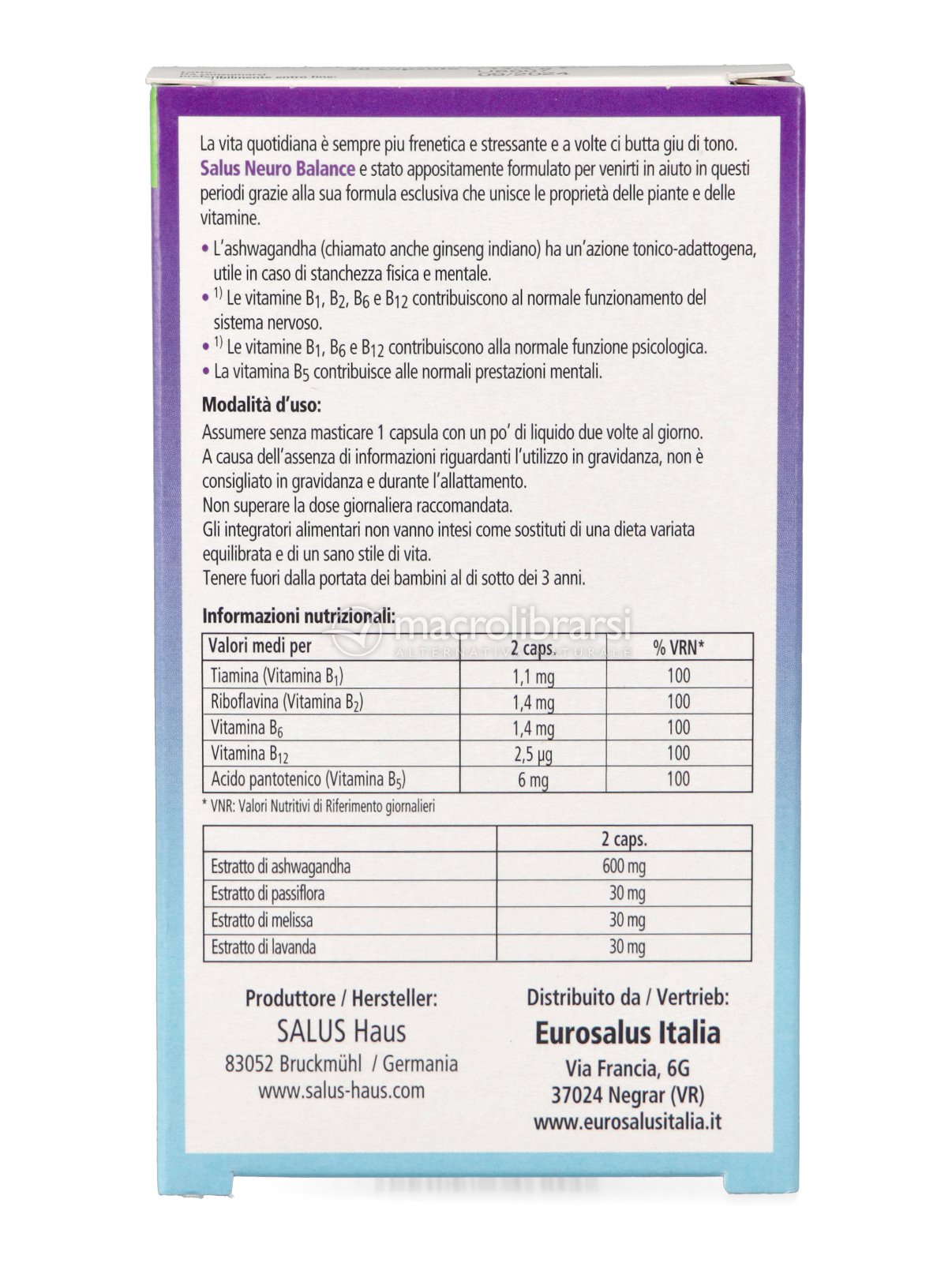 Disclaimer | Non superare la dose giornaliera consigliata. Gli integratori alimentari non vanno intesi come sostituti di una dieta variata ed equilibrata. Tenere fuori dalla portata dei bambini al di sotto dei tre anni. Non utilizzare in gravidanza e nei bambini o comunque per periodi prolungati senza sentire il parere del medico. Conservare in luogo asciutto e lontano da fonti di calore. Richiudere la confezione dopo l'uso. Macrolibrarsi ricorda l'importanza di seguire uno stile di vita sano e un'alimentazione variata ed equilibrata. |