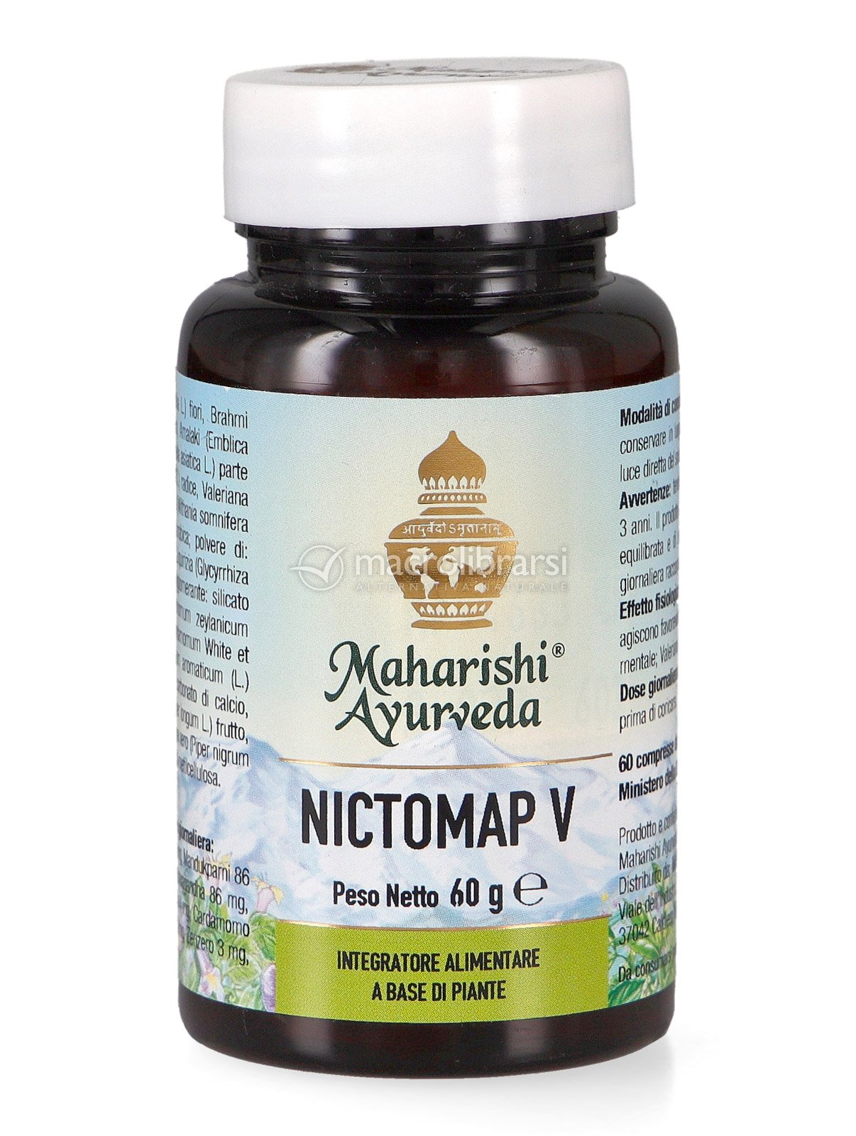 Nictomap V è un integratore alimentare in compresse, formulato secondo l'antica tradizione ayurvedica a base di piante ed estratti vegetali con la capacità di favorire il sonno fisiologico. Contiene: