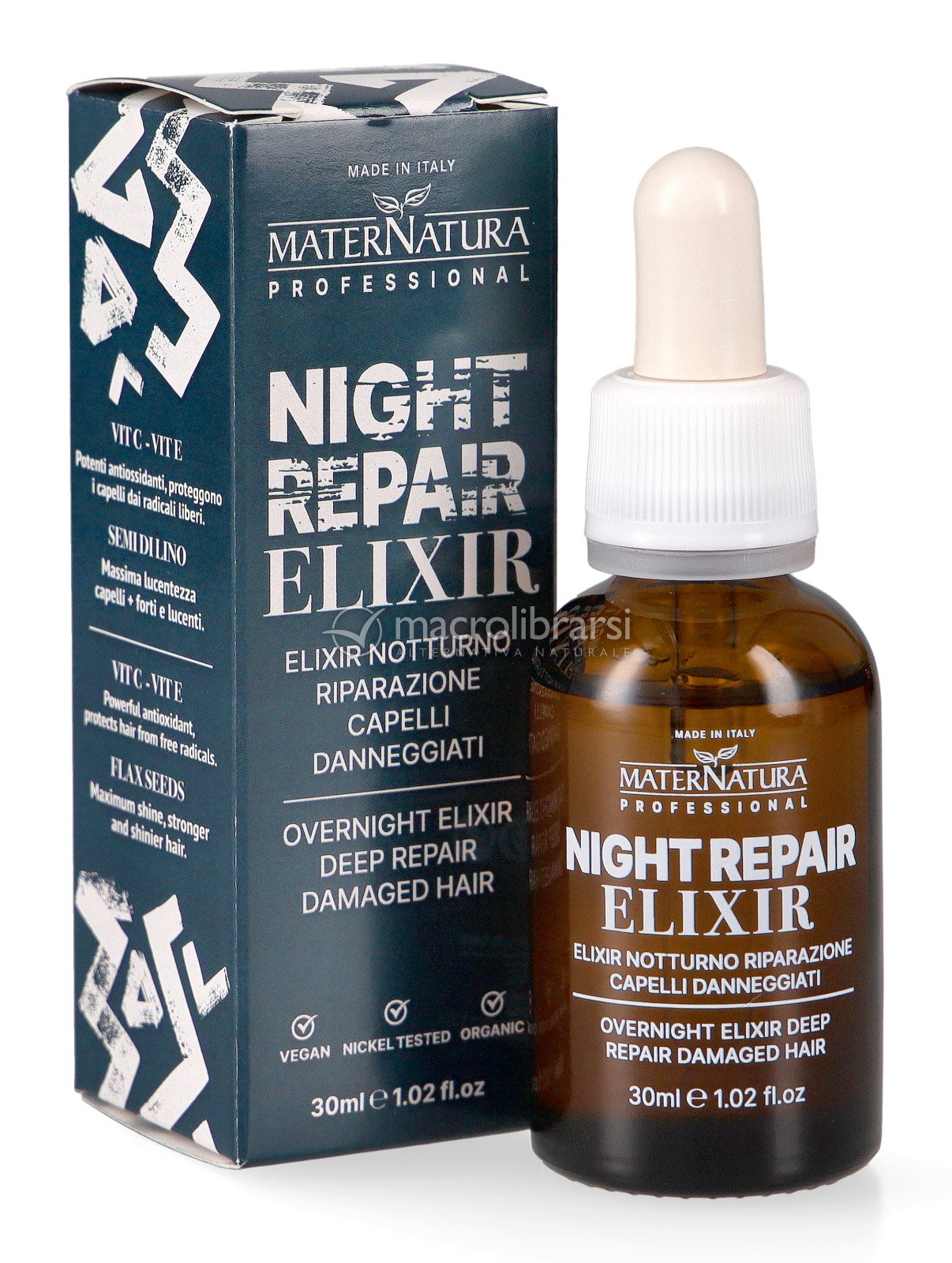 Ideale come trattamento ristrutturante, anti-crespo e protettivo, Night Repair Elixir di Maternatura non unge, si assorbe rapidamente e lascia i capelli morbidi, protetti e lucenti grazie alla sinergia degli ingredienti naturali che lo compongono: vitamina C ed E proteggono i capelli dai radicali liberi, mentre l'estratto di semi di Lino garantisce massima lucentezza e capelli più forti e lucenti