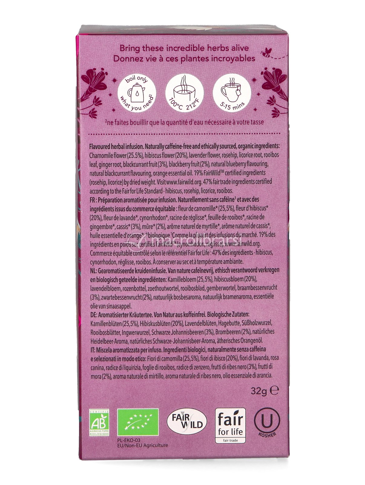 Una ricetta accuratamente studiata dagli esperti erboristi Pukka con frutti di bosco, camomilla, valeriana ed echinacea, tua alleata anche nel supportare il benessere stagionale. Ingredienti coltivati biologicamente, di origine etica e naturalmente privi di caffeina.
