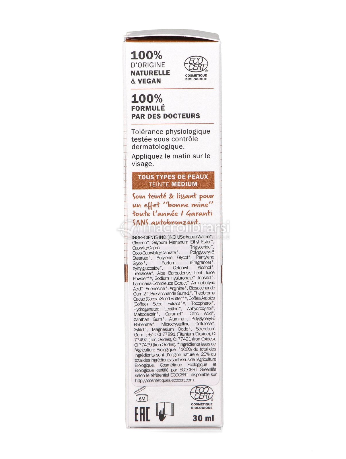 Aqua (Water)°, Glycerin°, Silybum Marianum Ethyl Ester°, Caprylic/Capric Triglyceride°, Butylene Glycol°, Coco-Caprylate/Caprate°, Glyceryl Stearate Citrate°, Polyglyceryl-6 Stearate°, Parfum (Fragrance)°, Xylitylglucoside°, Bentonite°, Sodium Stearoyl Glutamate°, Trehalose°, Aloe Barbadensis Leaf Juice Powder°*, Sodium Hyaluronate°, Inositol°, Laminaria Ochroleuca Extract°, Aminobutyric Acid°, Biosaccharide Gum-2°, Biosaccharide Gum-1°, Theobroma Cacao (Cocoa) Seed Butter°*, Citric Acid°, Xanthan Gum°, Arginine°, Tocopherol°, Hydrogenated Lecithin°, Anhydroxylitol°, Adenosine°, Phytic Acid°, Maltodextrin°, Caramel°, Alumina°, Polyglyceryl-6 Behenate°, Magnesium Oxide°, Glyceryl Caprylate°, Xylitol°, Coffea Arabica (Coffee) Seed Extract°*. [+/- May Contain : CI 77891 (Titanium Dioxide)°, CI 77492 (Iron Oxides)°, CI 77491 (Iron Oxides)°, CI 77499 (Iron Oxides)°] - *da Agricoltura Biologica - °100% del totale è di origine naturale