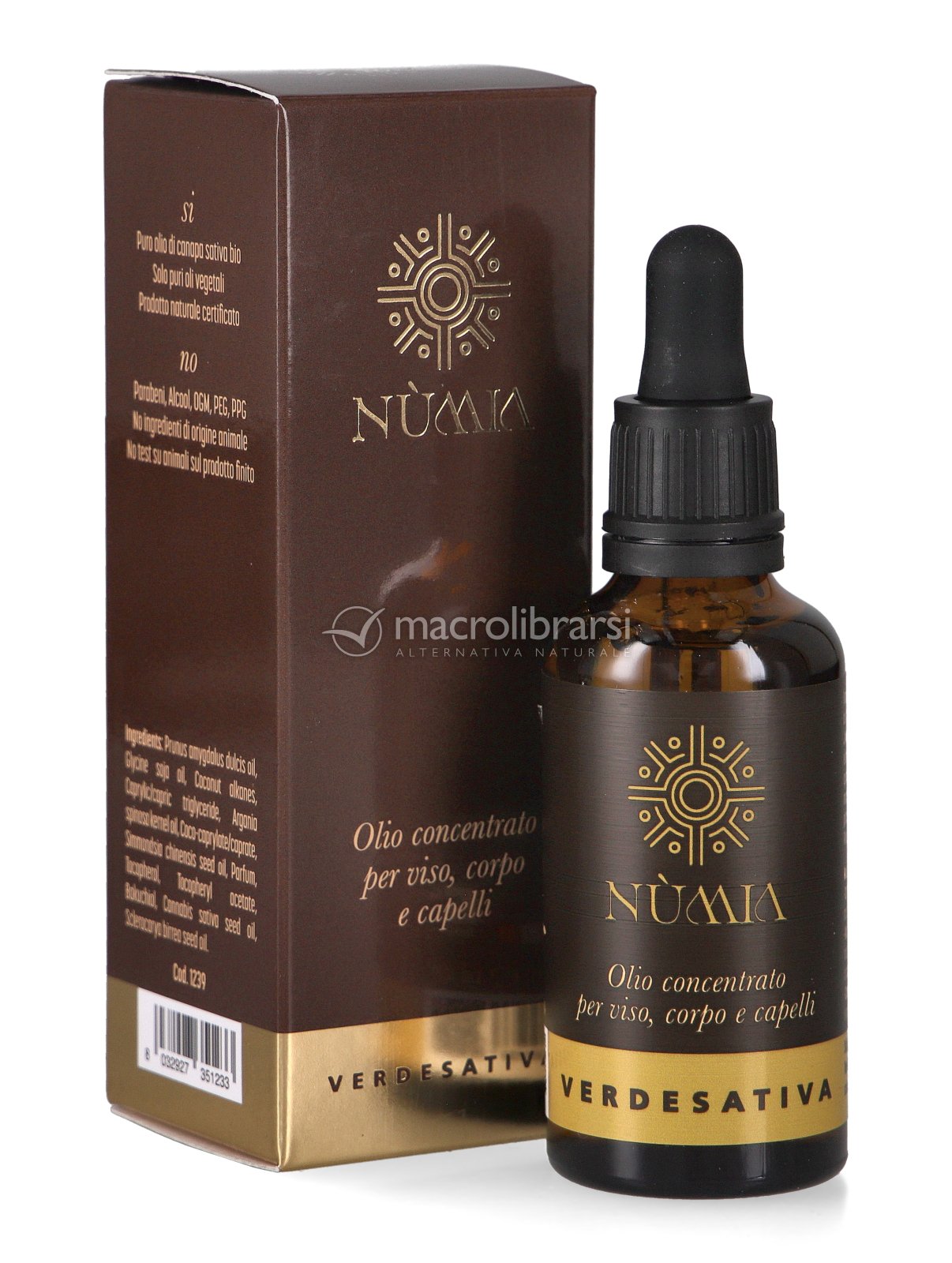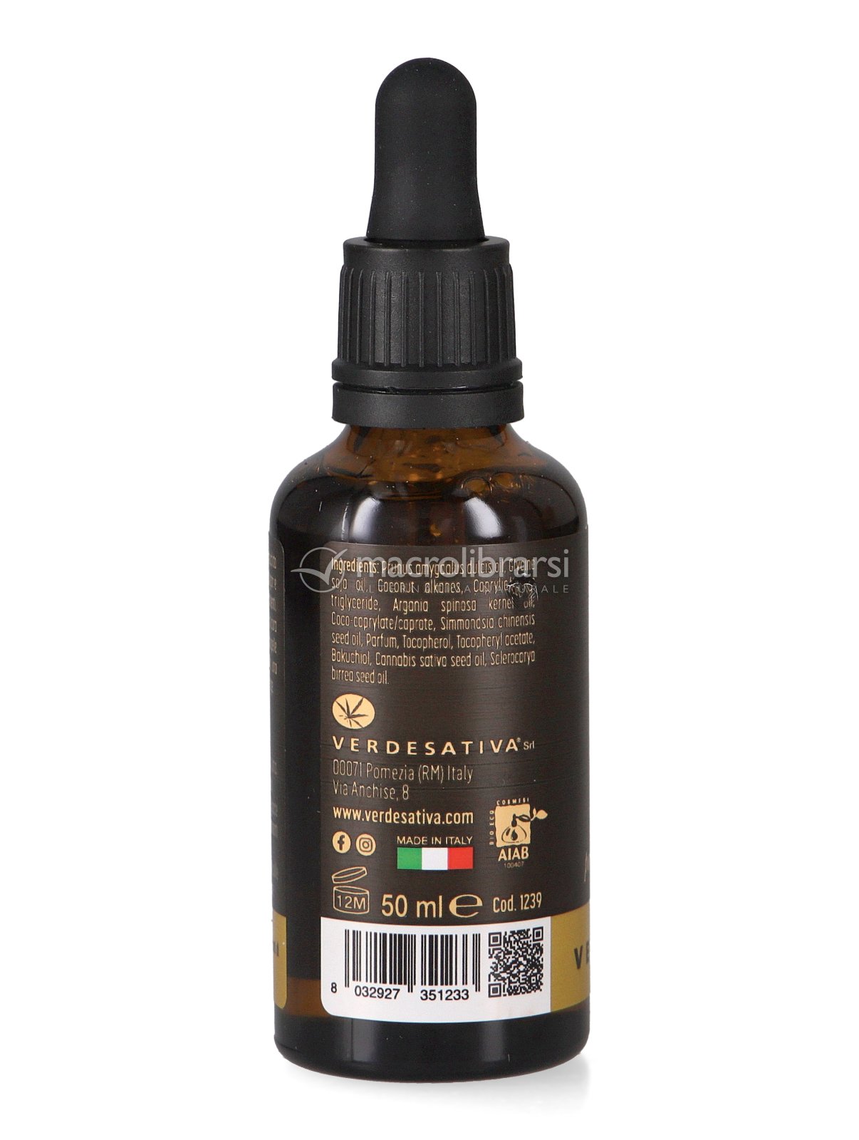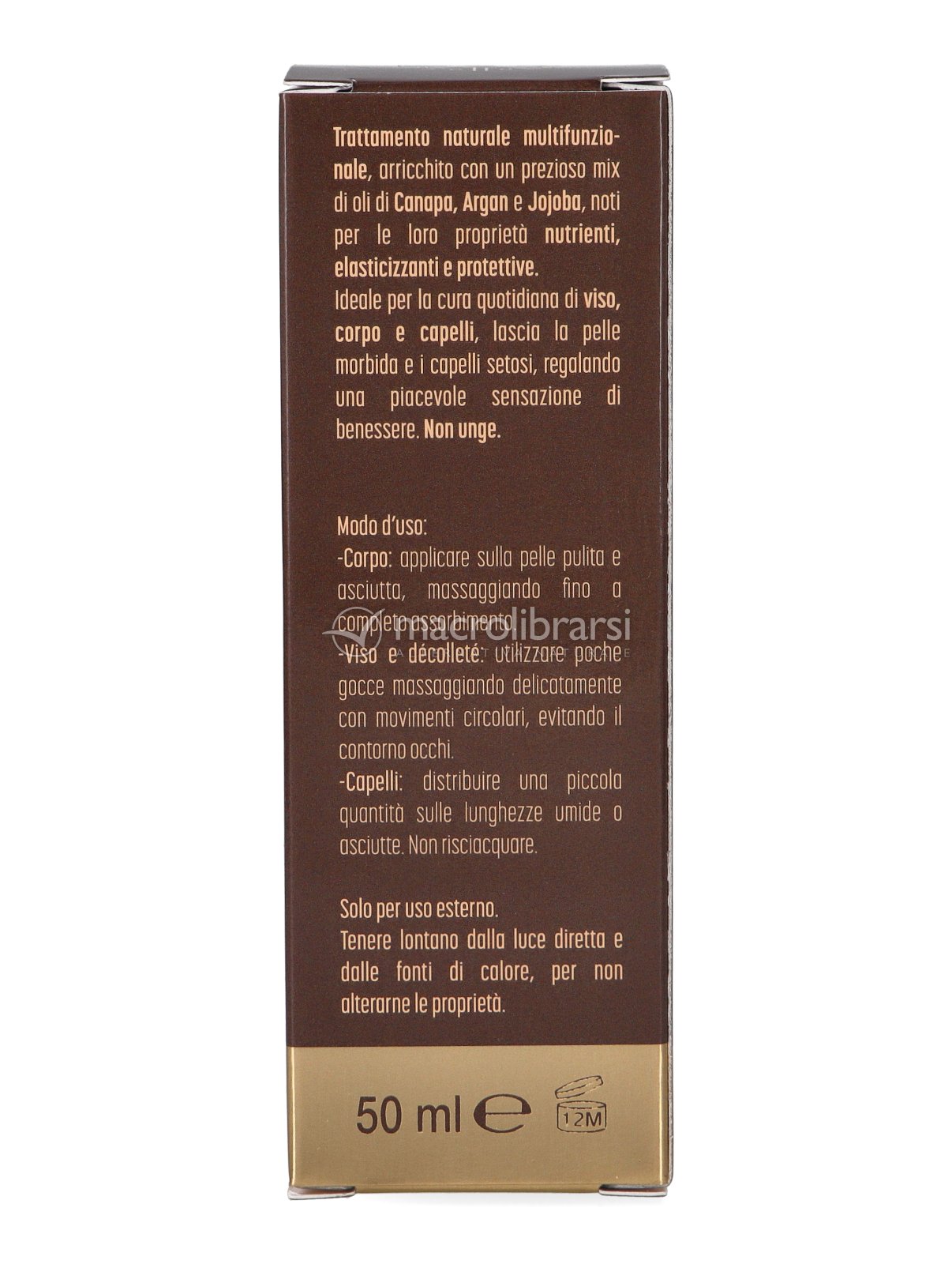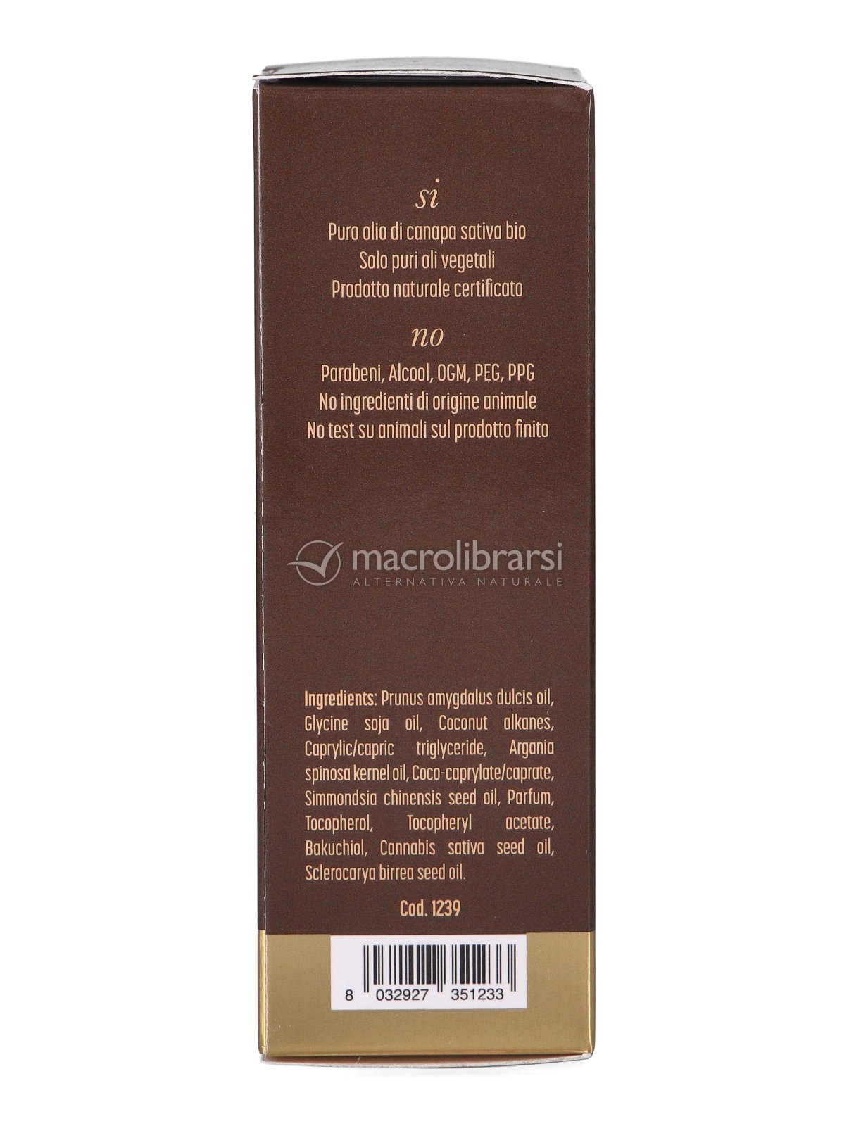| Note | SI: puro olio di Canapa sativa bio, solo puri oli vegetali, prodotto naturale certificato; NO: Parabeni, Alcool, OGM, PEG, PPG, no ingredienti di origine animale, no test su animali sul prodotto finito. |
