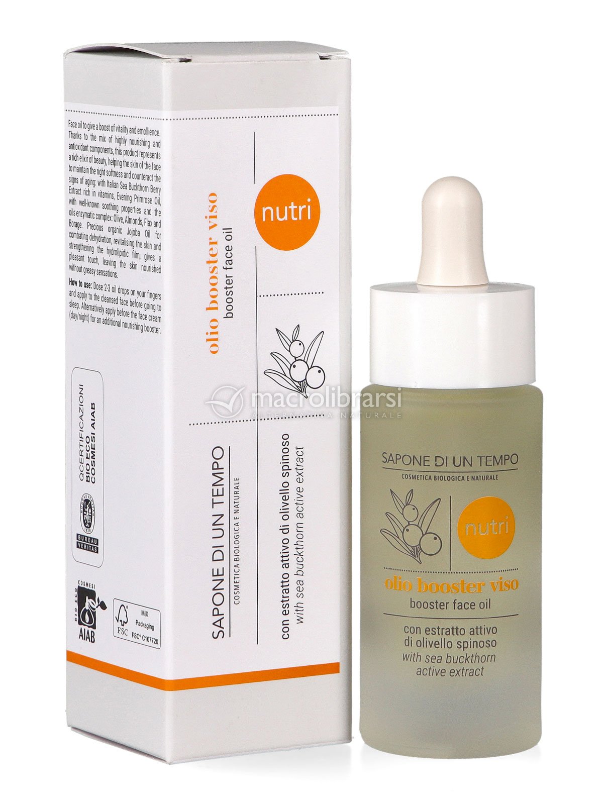 L'Olio Booster Viso Bio di Sapone di un Tempo unisce attivi vegetali ricchi di nutrienti e antiossidanti per aiutare la pelle a contrastare i segni del tempo, sostenere l’elasticità e proteggere dalla disidratazione.