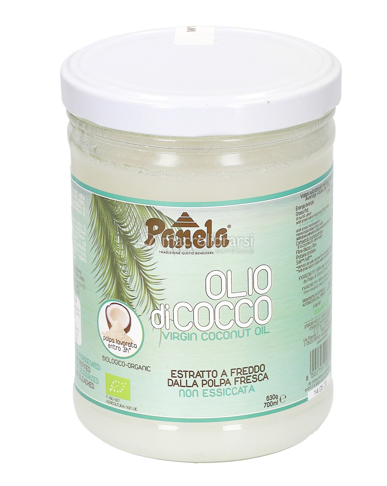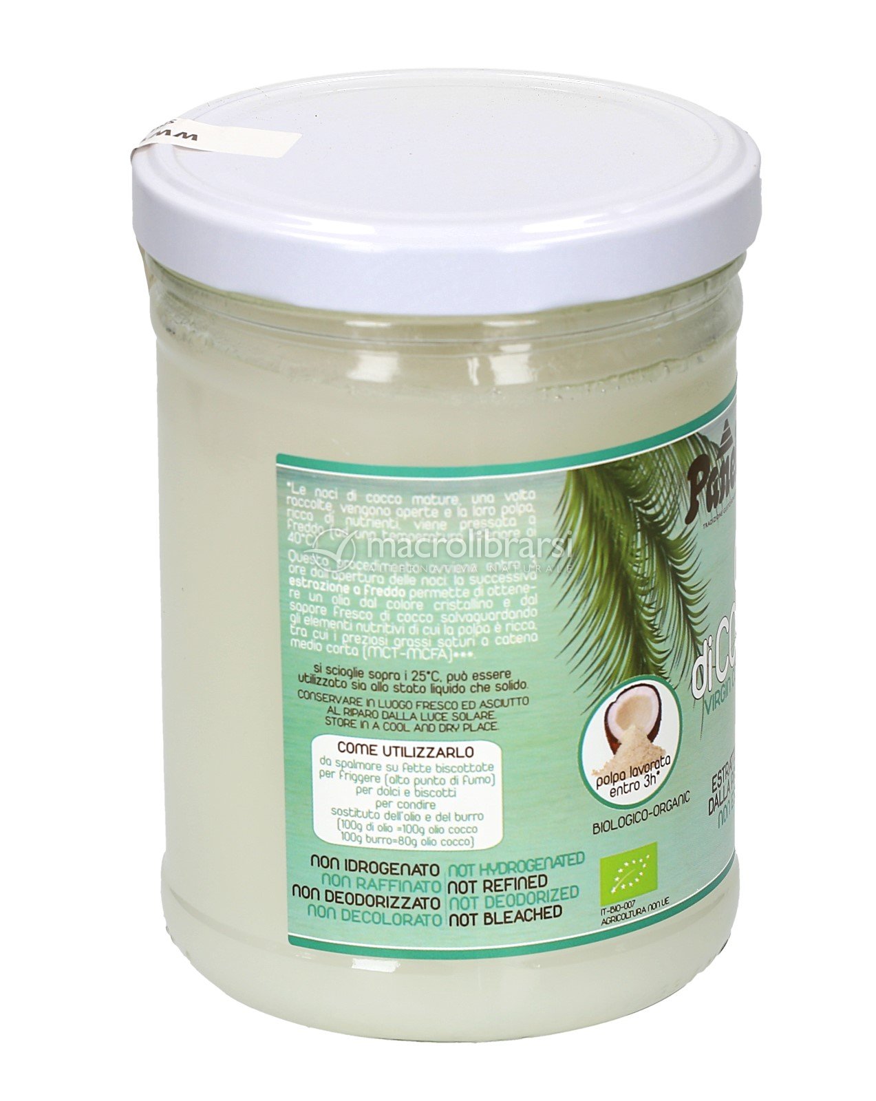 E' un olio vergine, con un delicato sentore di cocco, ricco di acidi grassi saturi a catena medio - corta MCT - MCFA (da non confondere con i grassi idrogenati o con quelli dell'olio raffinato di palma, quest'ultimo ottenuto dalla palma da olio elaeis guineensis e non dalla palma da cocco cocos nucifera) tra cui il noto acido laurico, elemento presente anche nel latte materno. La coltivazione delle palme avviene in maniera non intensiva e nelle lavorazioni non si fa ricorso a processi industriali di raffinazione, sbiancatura e deodorizzazione. E' un olio dalle molteplici proprietà, che per questo, è noto anche in ambito erboristico e cosmetico. Può essere utilizzato in cucina o consumato tal quale. Al di sopra dei 25°C assume lo stato liquido, senza nessuna alterazione delle sue proprietà. Non è necessario conservarlo in frigorifero.