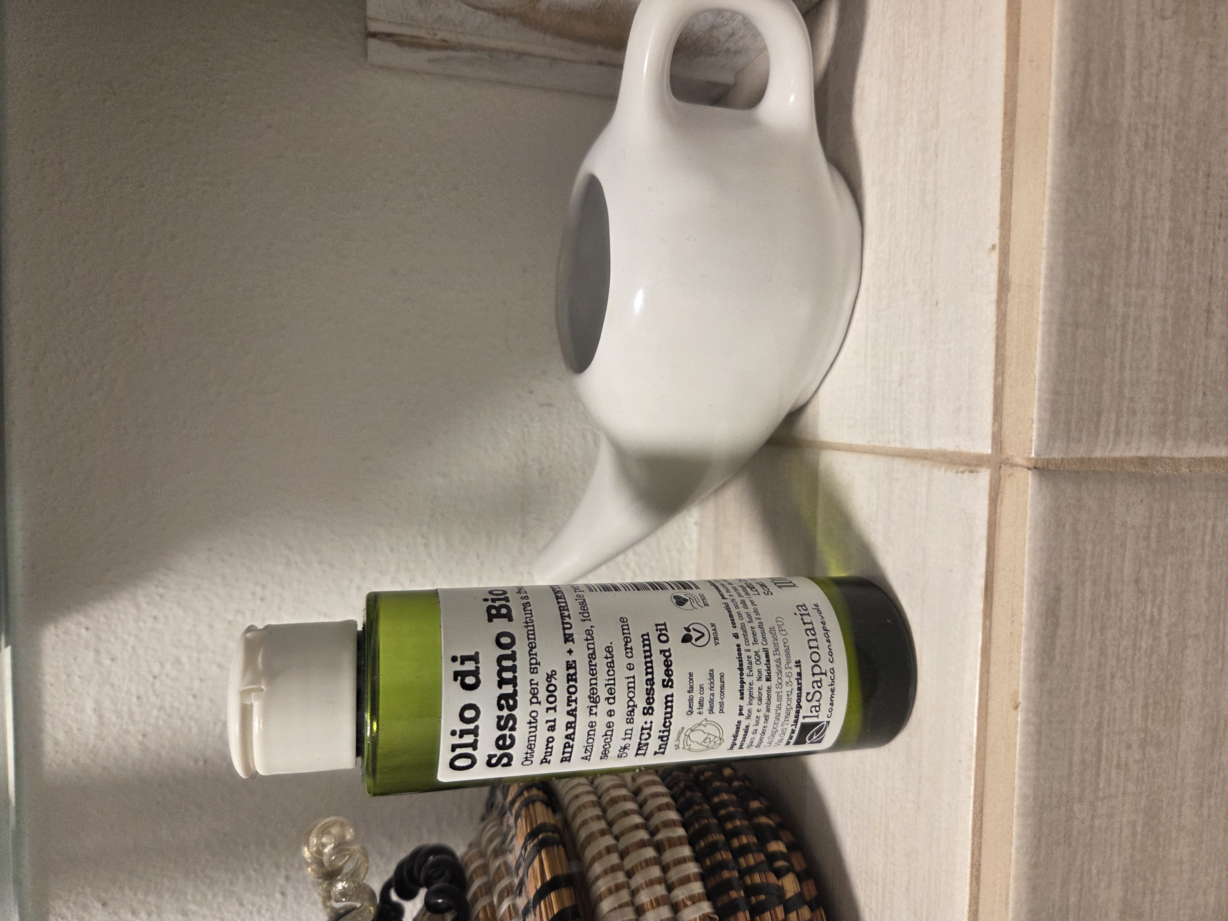 Olio di sesamo delicato da usare sia puro che con olii essenziali per massaggi. Molto gradevole lo bottiglietta e il formato. Sull'etichetta ci sono tutte le informazioni. Consiglio