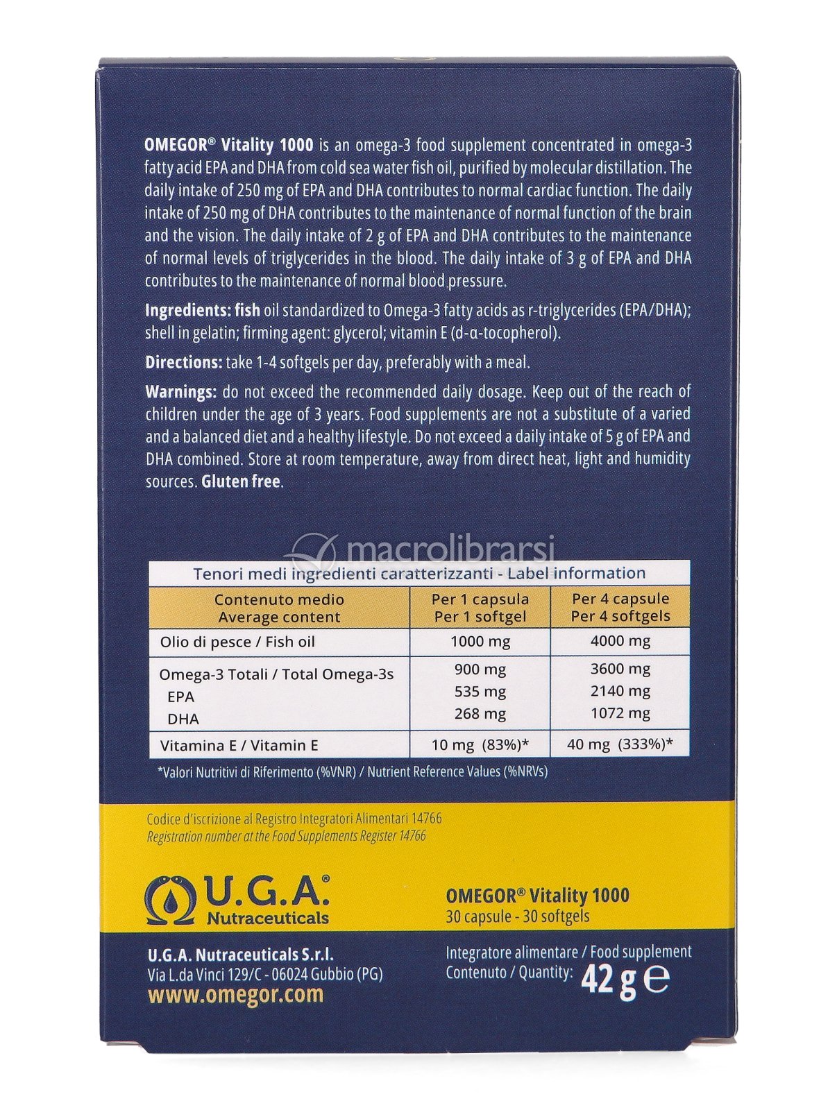Omegor Vitality 1000 è un integratore che contiene un estratto ultra purificato e concentrato di acidi grassi omega-3 a catena lunga EPA e DHA, con una concentrazione minima del 60% di EPA+DHA in rapporto 2:1, ottenuto per distillazione molecolare multipla. Questo processo si fonda su una tecnologia avanzata attraverso cui si ottengono due risultati importanti: