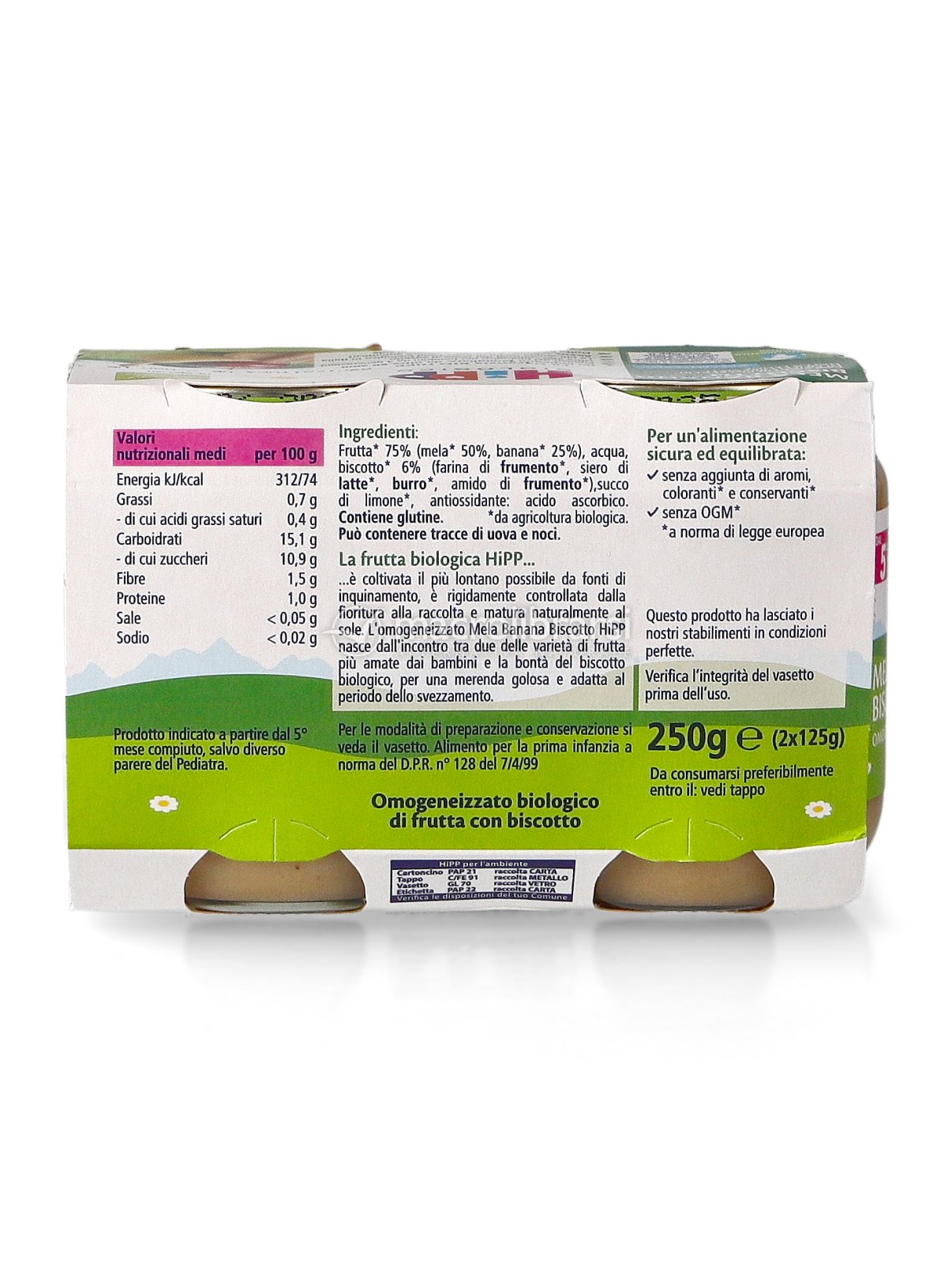 La dolcezza delle migliori mele e banane biologiche incontra la golosità del biscotto: una combinazione perfetta per una merenda sana e davvero gustosa, a partire da 5 mesi compiuti.
