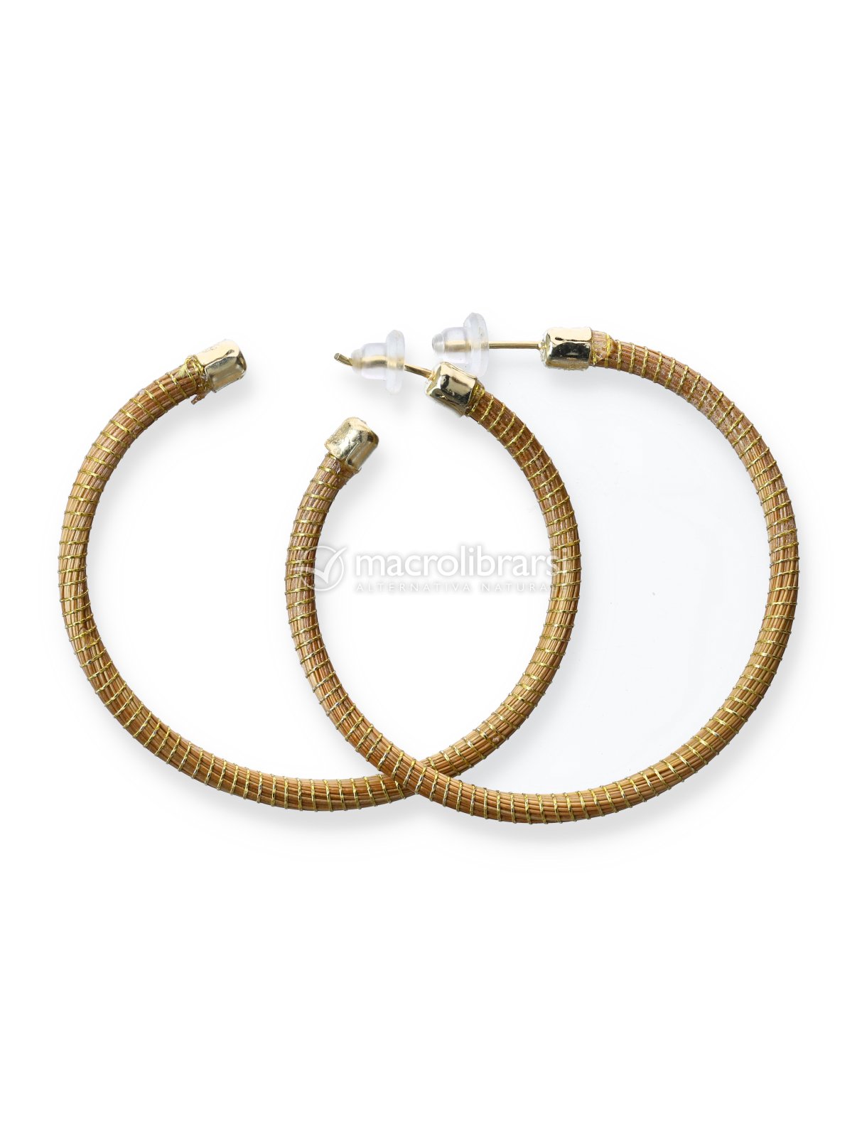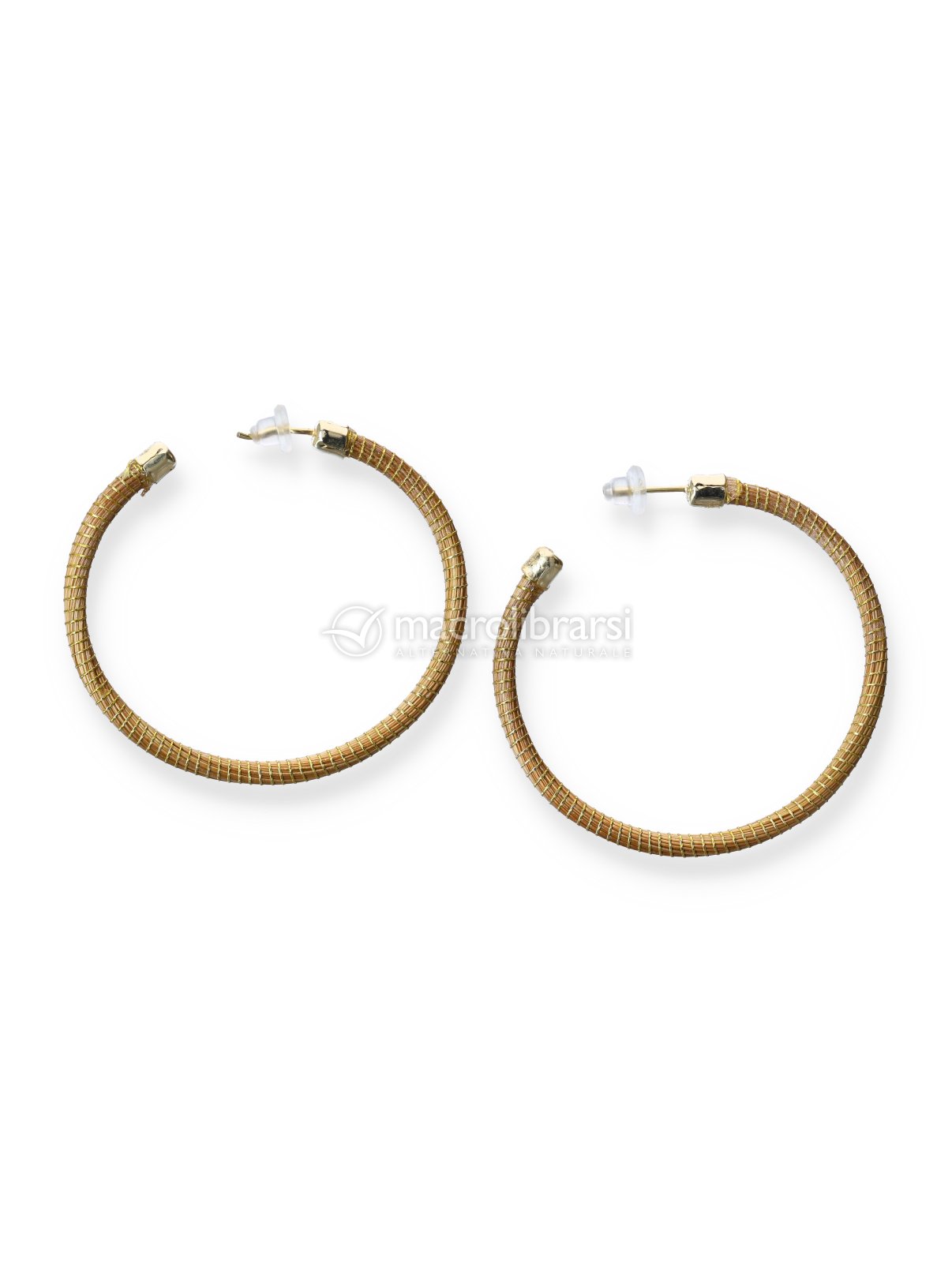 Orecchini con cerchio finemente lavorati con Capim Dourado, fibra naturale di origine vegetale. Un gioiello originale e dalla forte personalità.