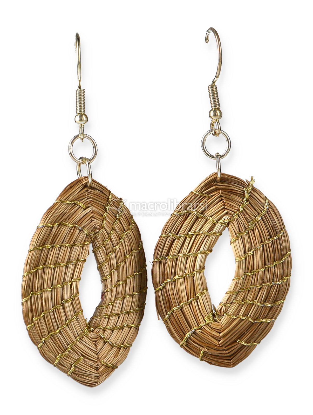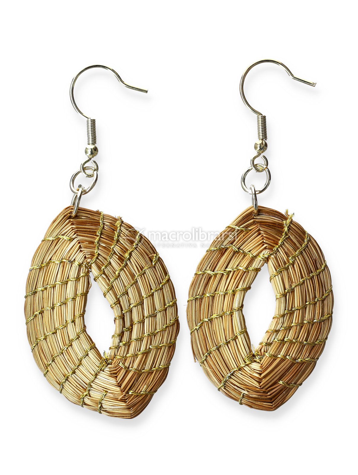 Orecchini con forma a foglia, finemente lavorati con Capim Dourado, fibra naturale di origine vegetale. Un gioiello originale e dalla forte personalità.