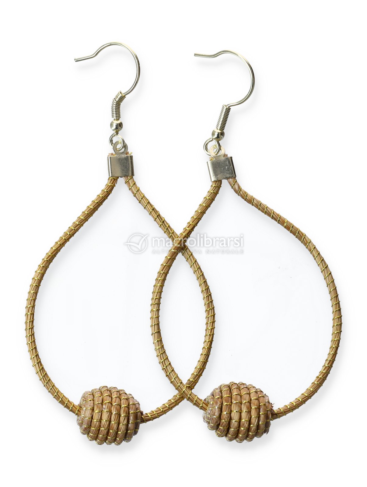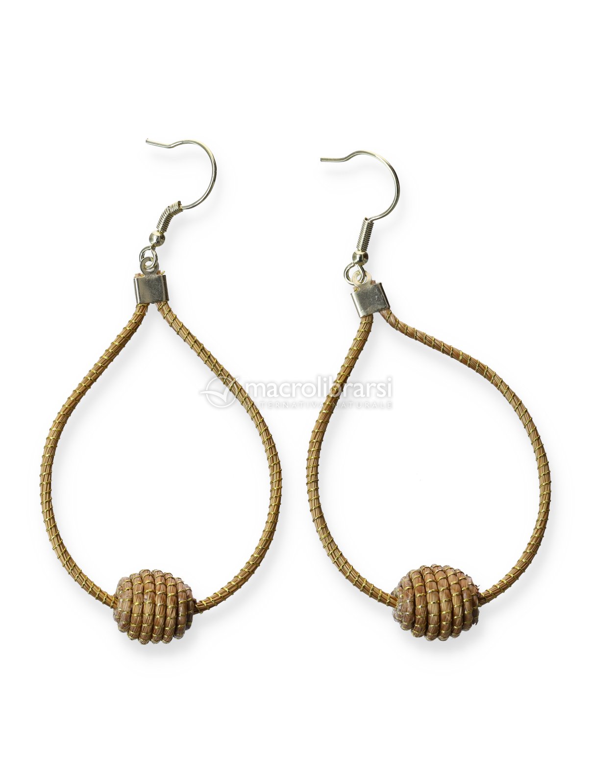 Orecchini con goccia e sfera finemente lavorati con Capim Dourado, fibra naturale di origine vegetale. Un gioiello originale e dalla forte personalità.