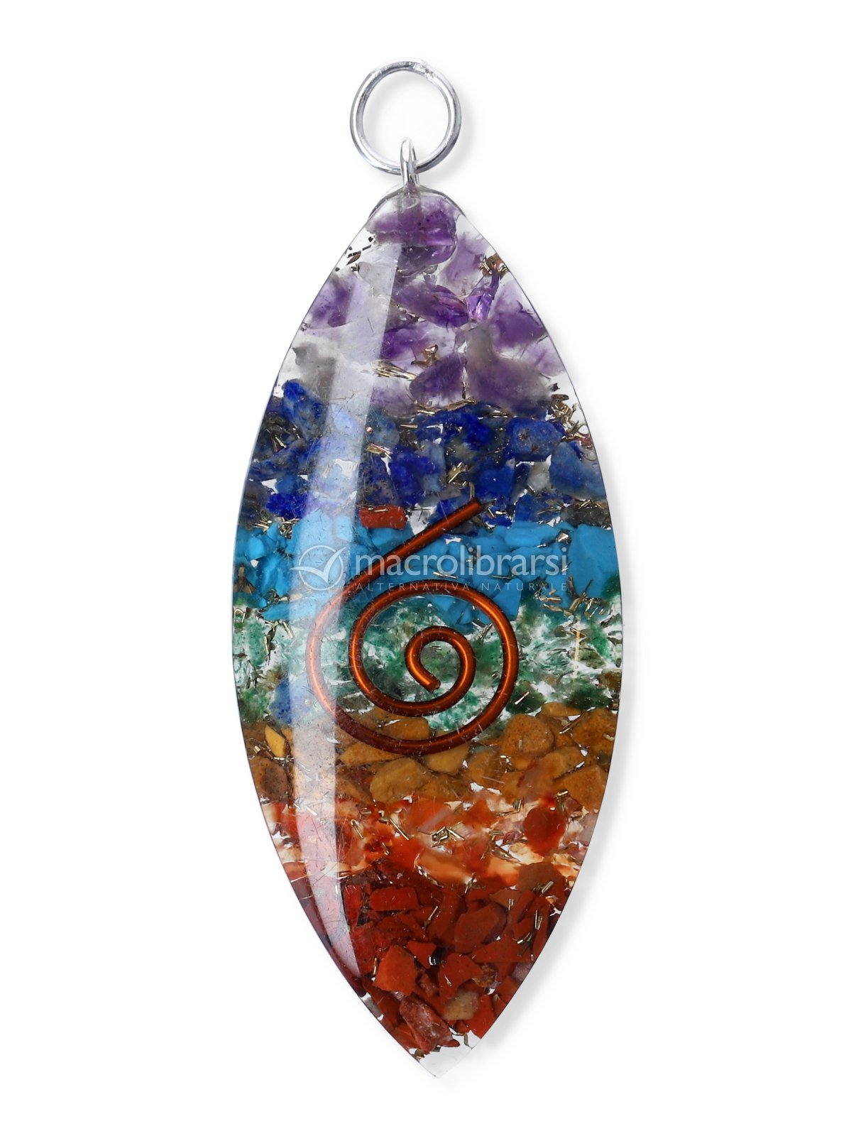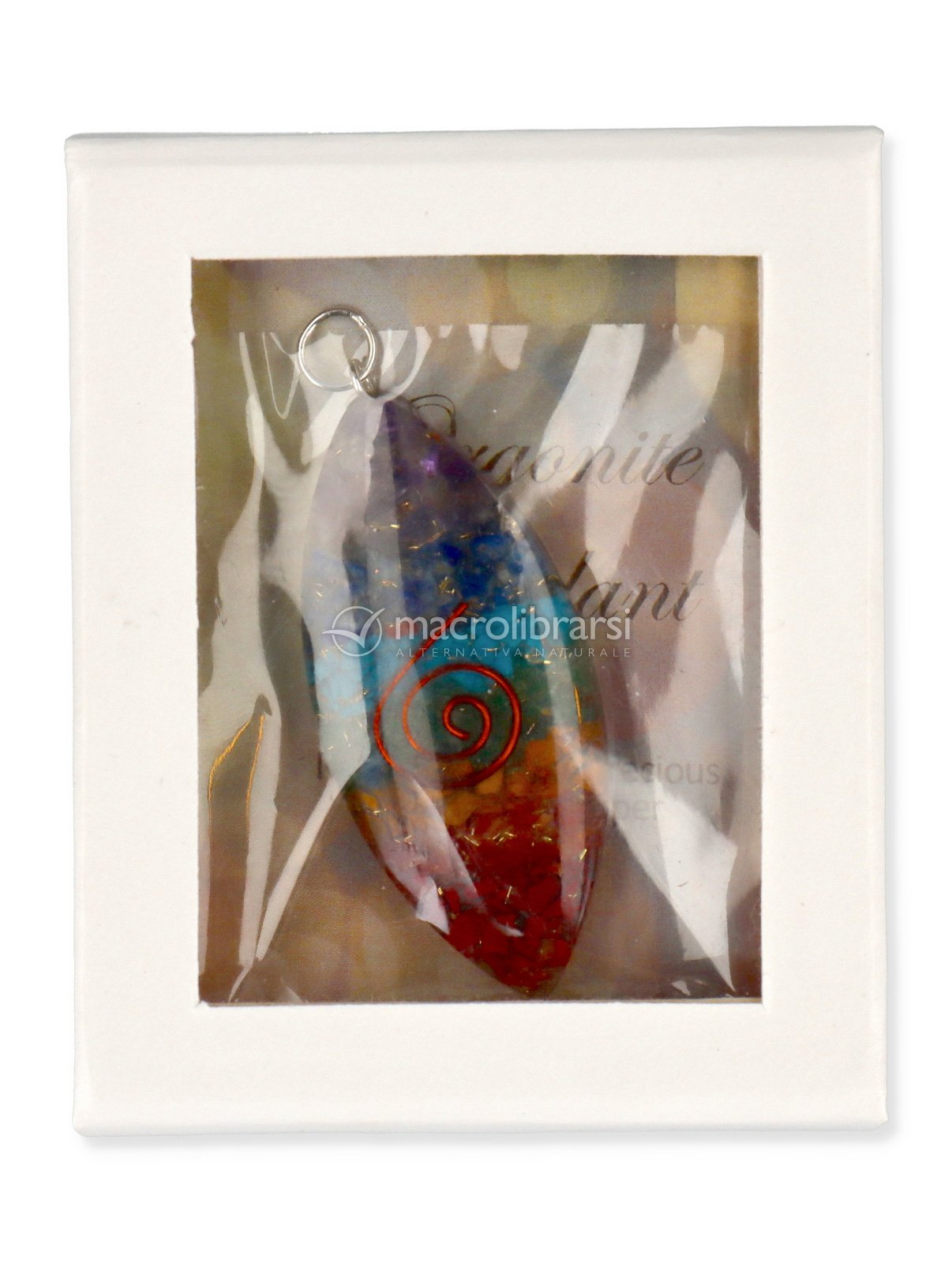 Ciondolo arcobaleno in Orgonite a Ovale Policromo è composto da cristalli, resina e metallo.