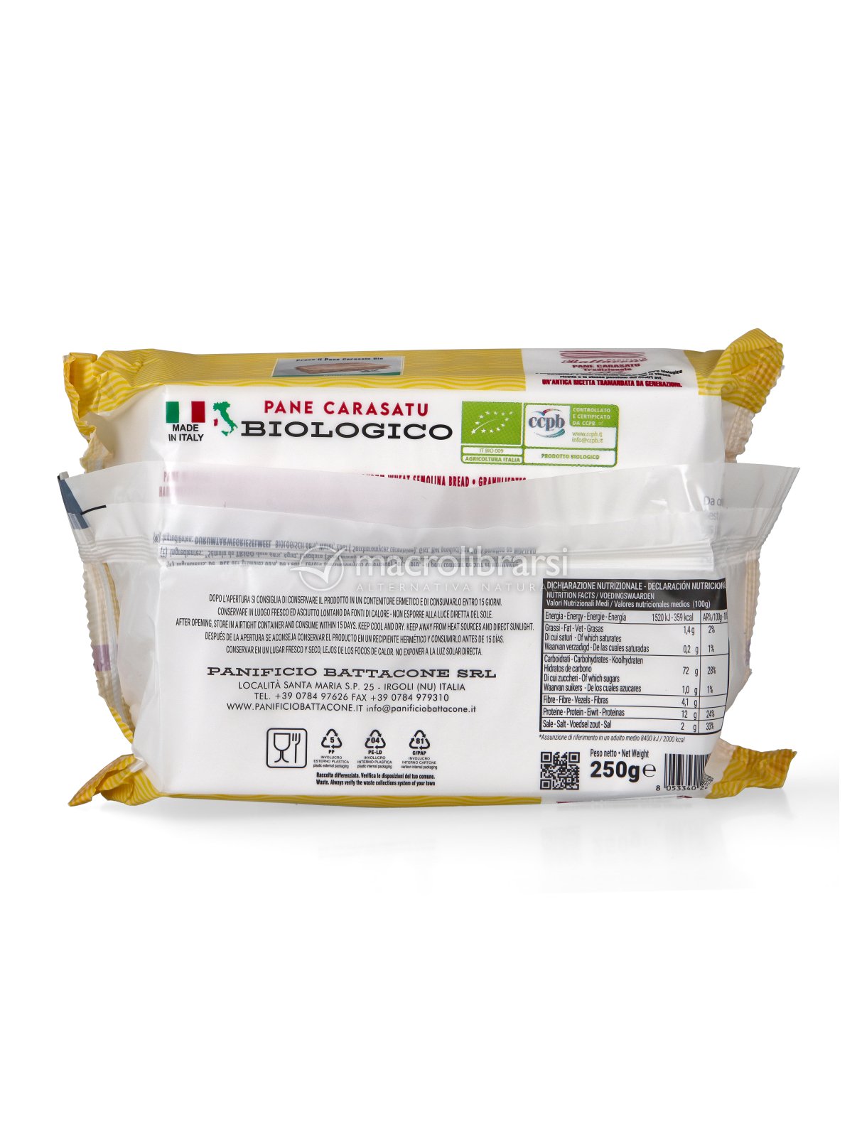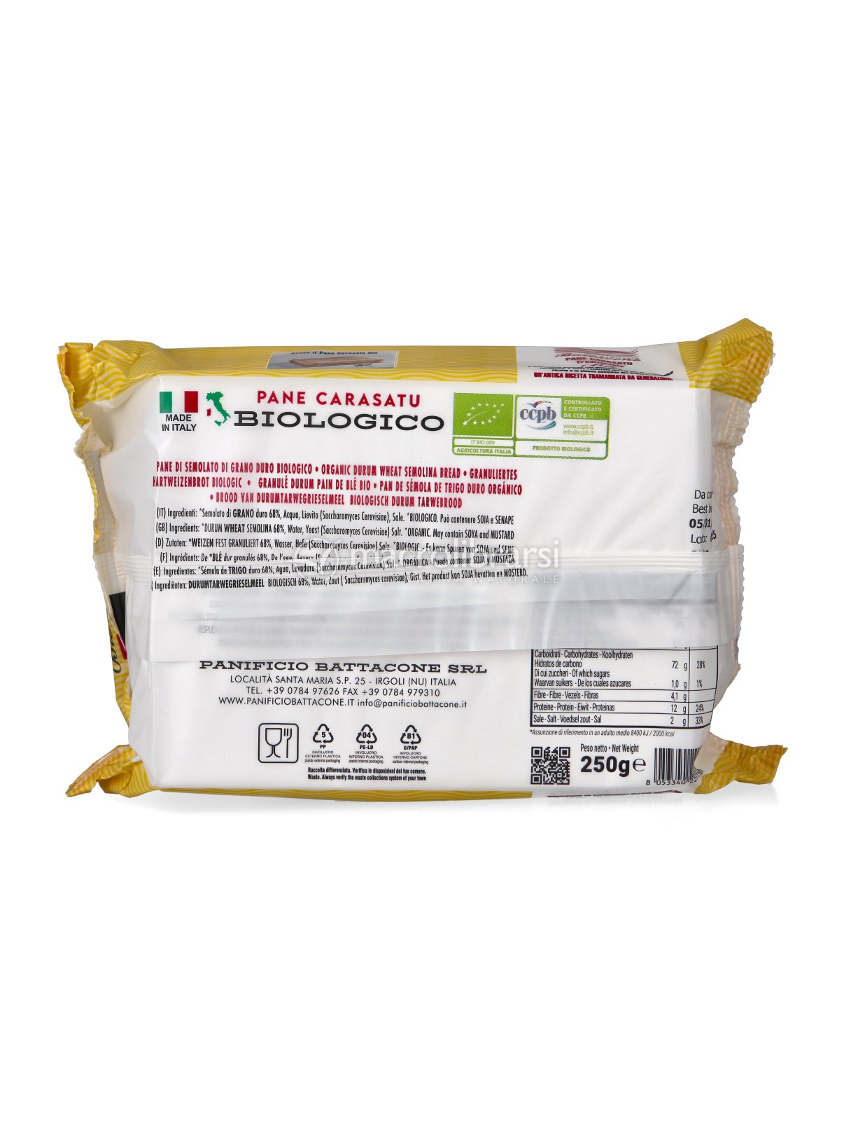 Il Pane Carasatu Bio è prodotto secondo la ricetta tradizionale della casa. Si ottiene impiegando farine da grano biologico, non trattato quindi con pesticidi di sintesi.