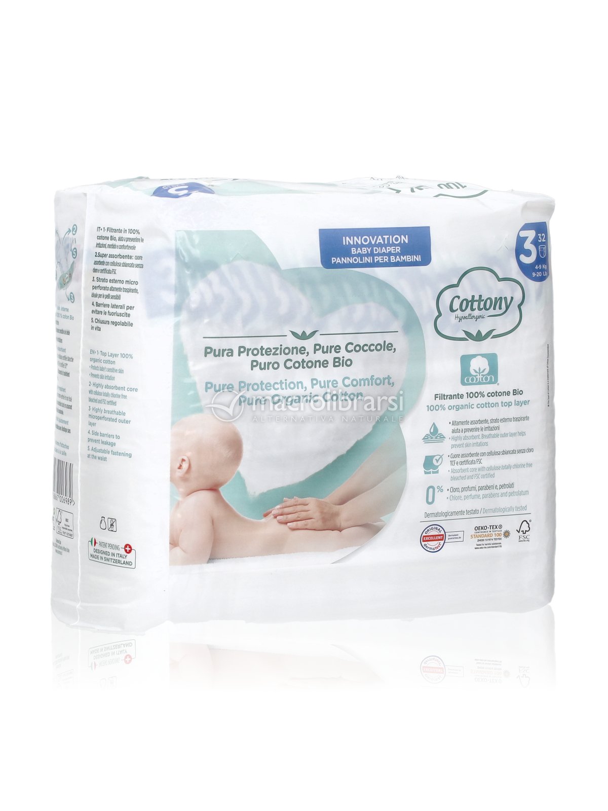 Pannolini in cotone biologico, per prevenire le irritazioni ed i rossori, e proteggere la pelle sensibile dei bambini.