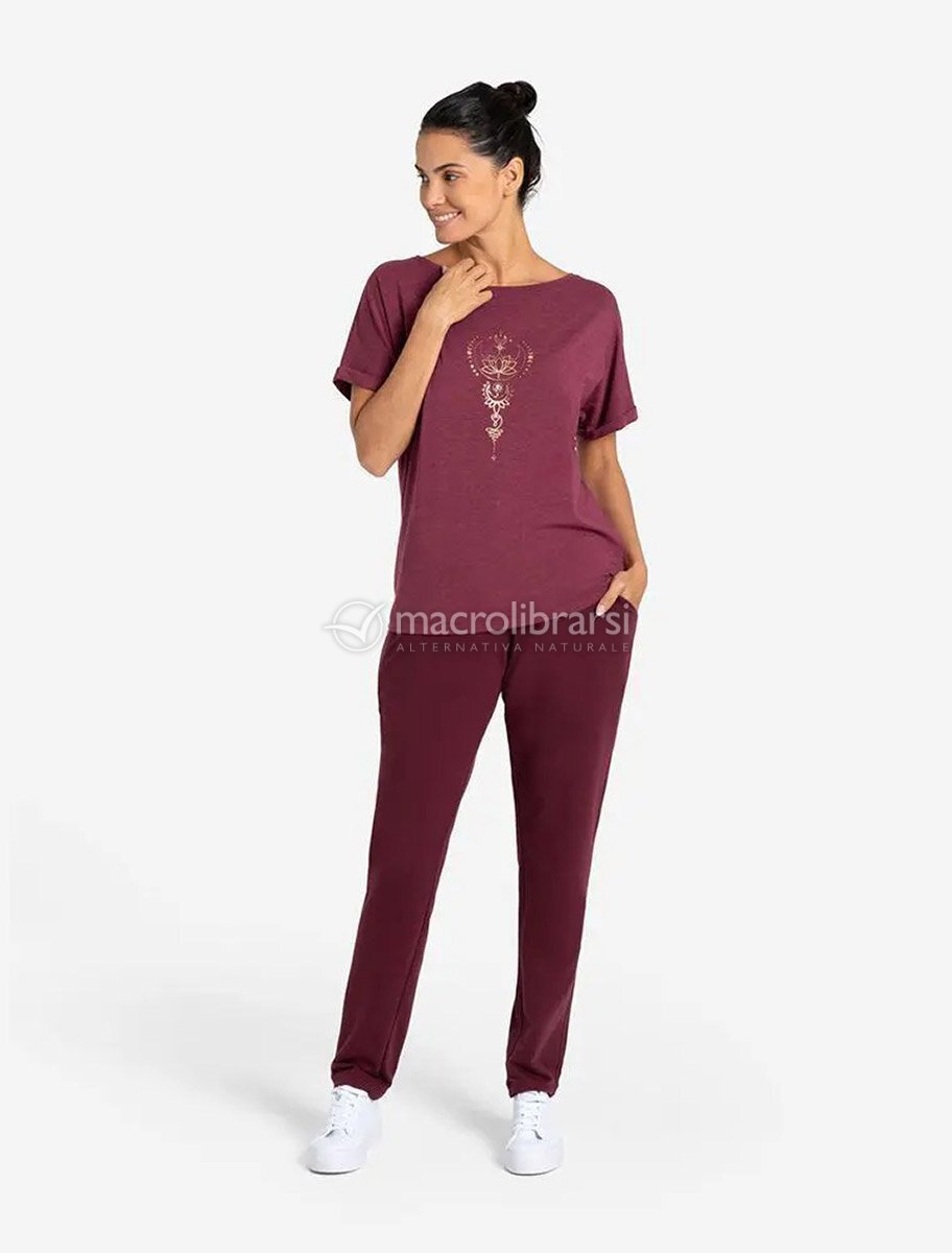 Il materiale morbido e vellutato dei pantaloni The Spirit of OM è una combinazione di cotone biologico e modal (cellulosa vegetale sostenibile) e invita a momenti di relax e riposo. Il materiale naturale è una vera coccola per te e per la tua pelle. Il taglio ampio ti consente una libertà di movimento illimitata. Anche il caldo colore rosso porpora conferisce un senso di relax e comfort e può essere abbinato meravigliosamente anche a un look casual.