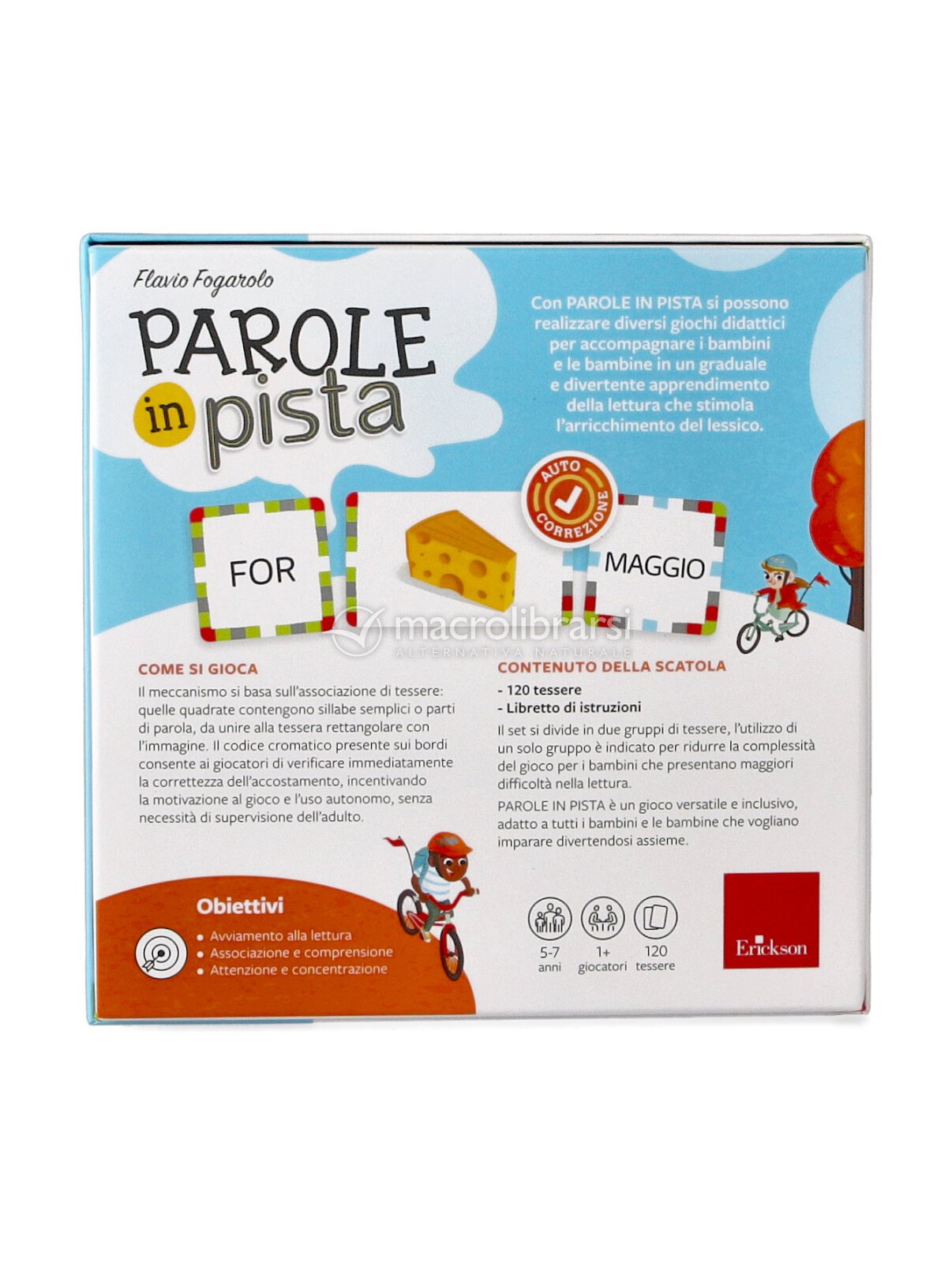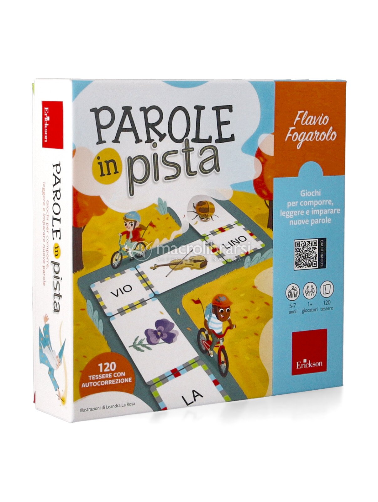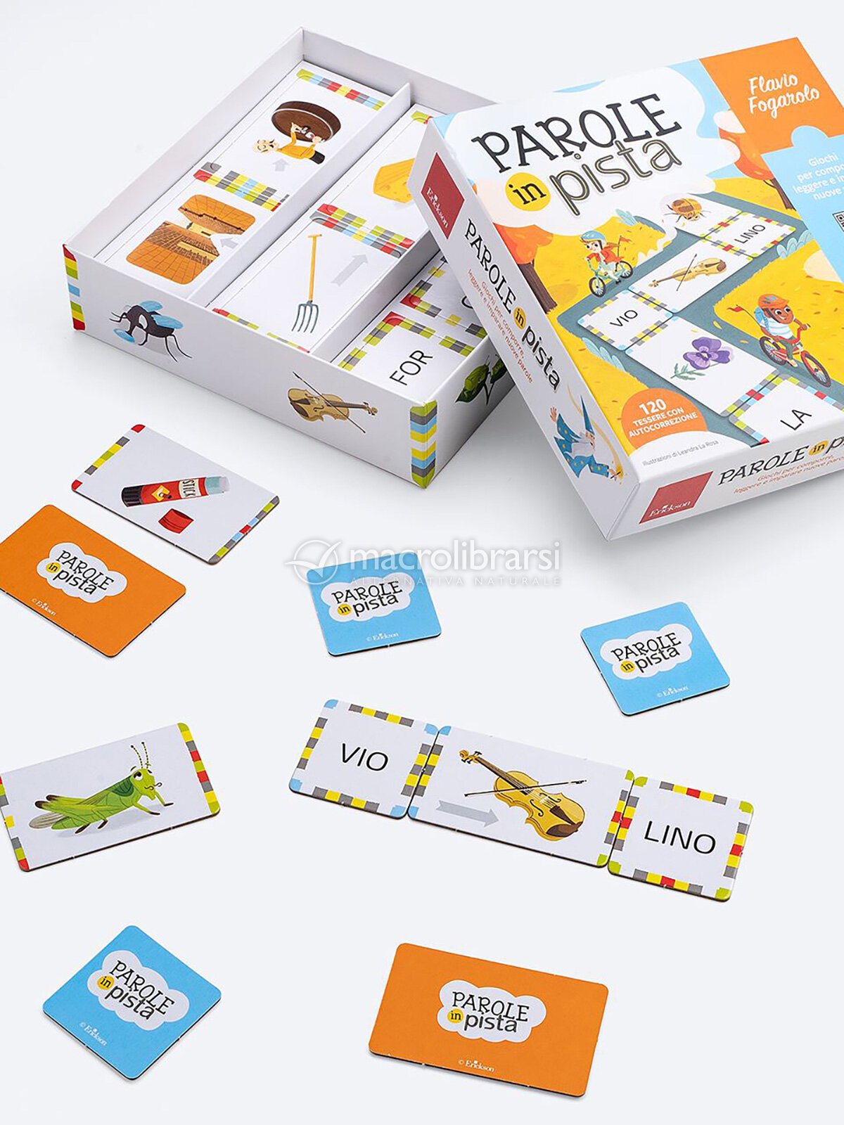 Parole in pista propone diversi giochi didattici inclusivi, progettati da Flavio Fogarolo, per accompagnare i bambini e le bambine in un graduale e divertente apprendimento della lettura che stimola l’arricchimento del lessico.