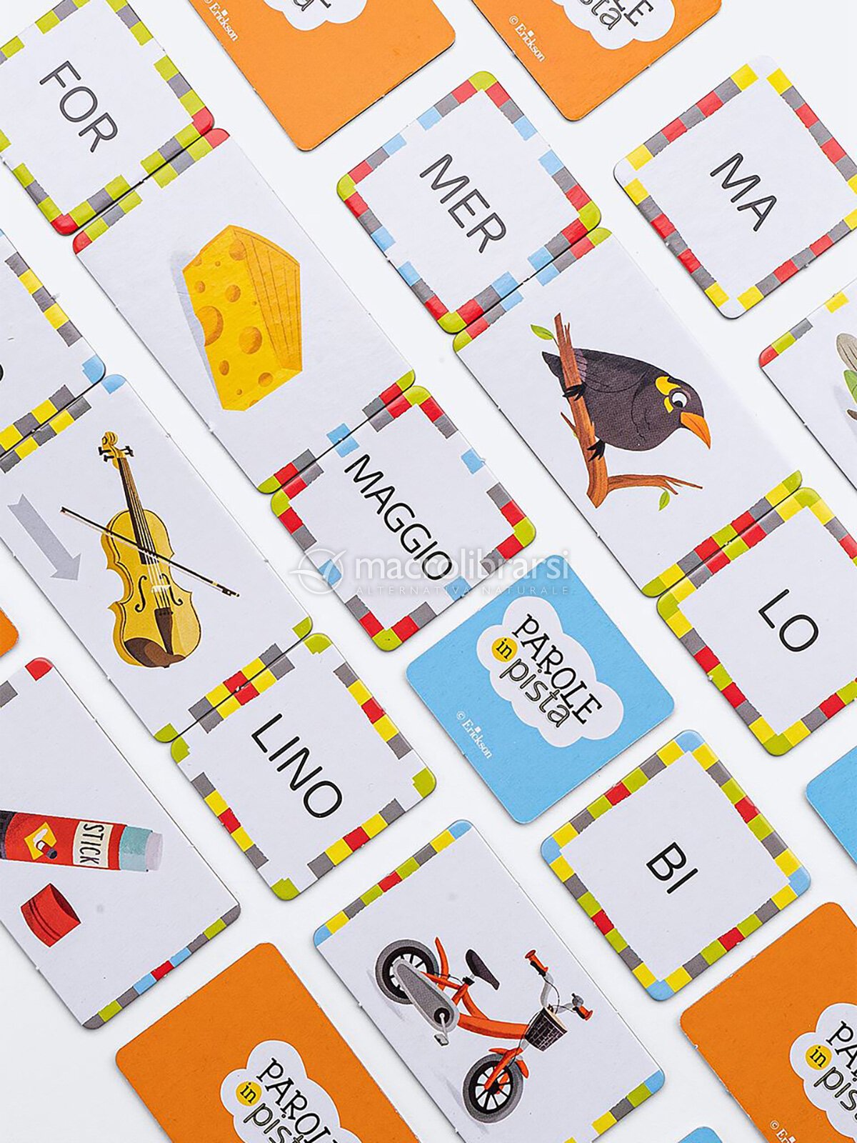 Il meccanismo di gioco si basa sull’associazione di tessere: quelle quadrate contengono sillabe semplici o parti di parola, ad esempio FOR - MAGGIO, da unire alla tessera rettangolare con l’immagine che rappresenta la parola, facilitandone la comprensione. Unendo le tessere si creano favolose piste di parole!