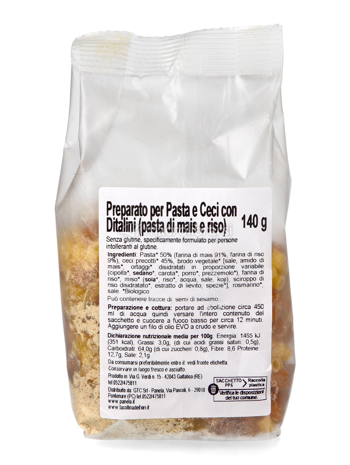 Pasta 50% (farina di mais 91%, farina di riso 9%) ceci precotti * 45%, brodo vegetale* (sale, amido di mais*, ortaggi*, disidratati in proporzione variabile (cipolla*, sedano*, carota*, porro*, prezzemolo*), farina di riso*, miso*, (soia+, riso*, acqua, sale, koji), sciroppo di riso disidratato*, estratto di lievito, spezie*), rosmarino+, sale.* Biologico.