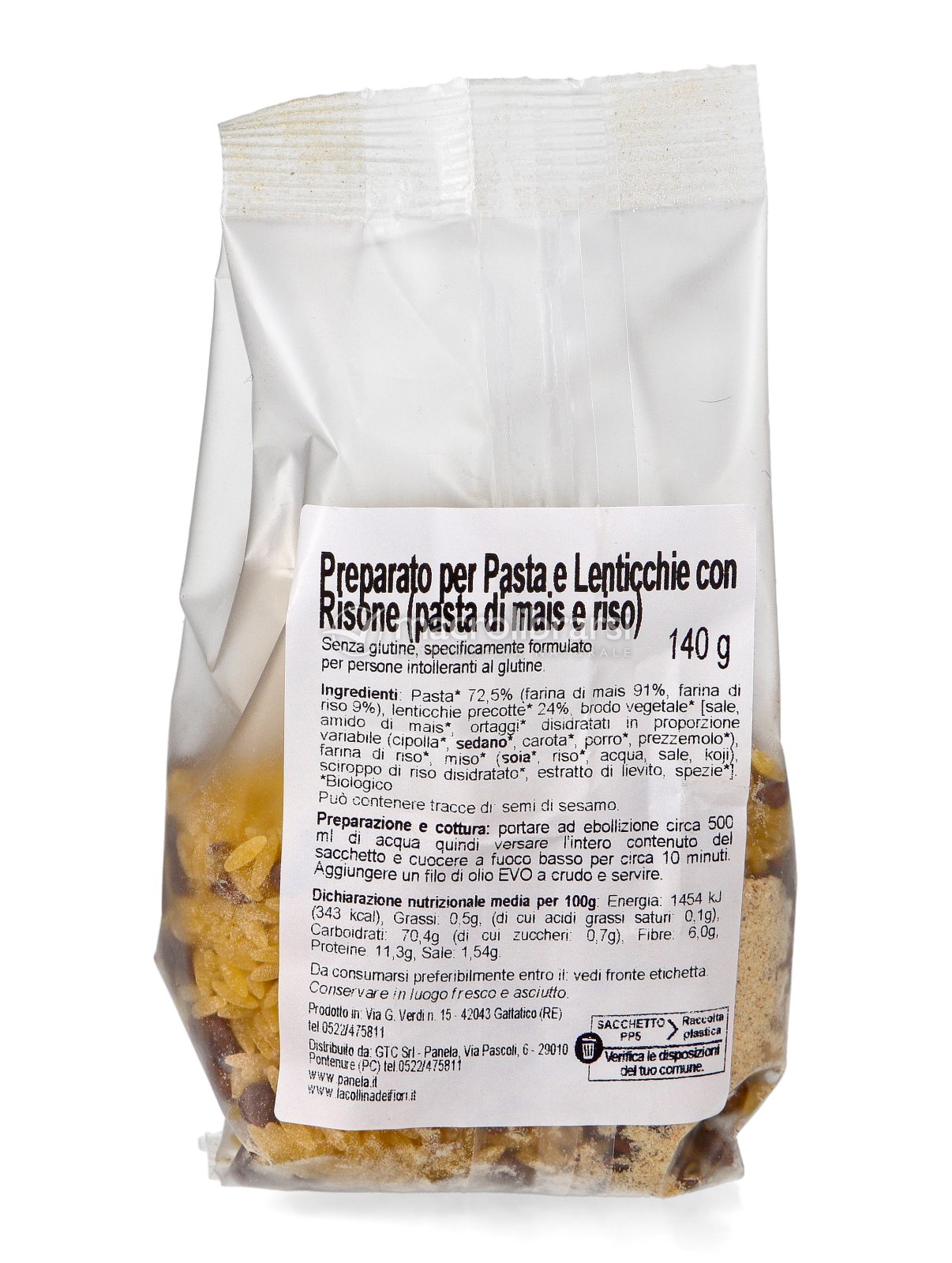 Pasta 72,5% (farina di mais 91%, farina di riso 9%) lenticchie precotte* 24%, brodo vegetale* (sale, amido di mais*, ortaggi*, disidratati in proporzione variabile (cipolla*, sedano*, carota*, porro*, prezzemolo*) farina di riso*, miso* (soia*, riso*, acqua, sale, koji), sciroppo di riso disidratato*, estratto di lievito, spezie*.*Biologico.