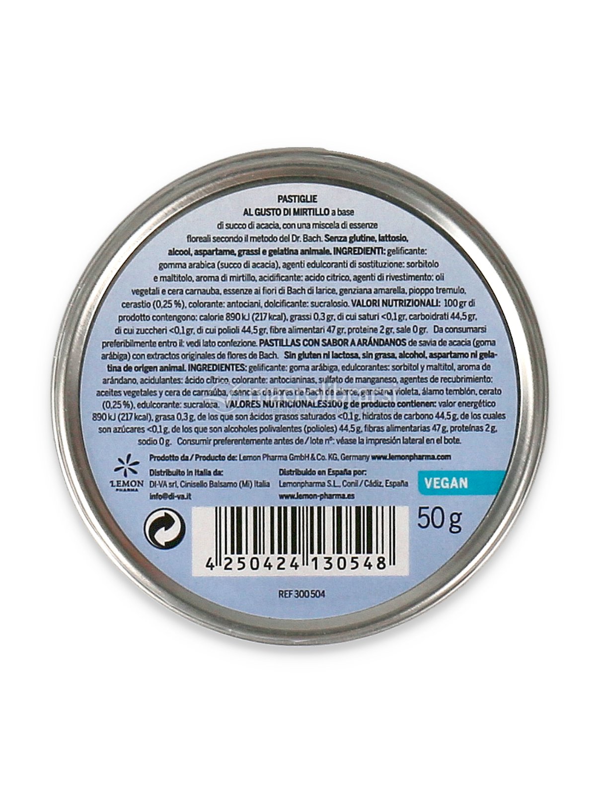 Pastiglie al gusto di lampone a base di succo di acacia, con una miscela di essenze floreali secondo il metodo del Dr. Bach.