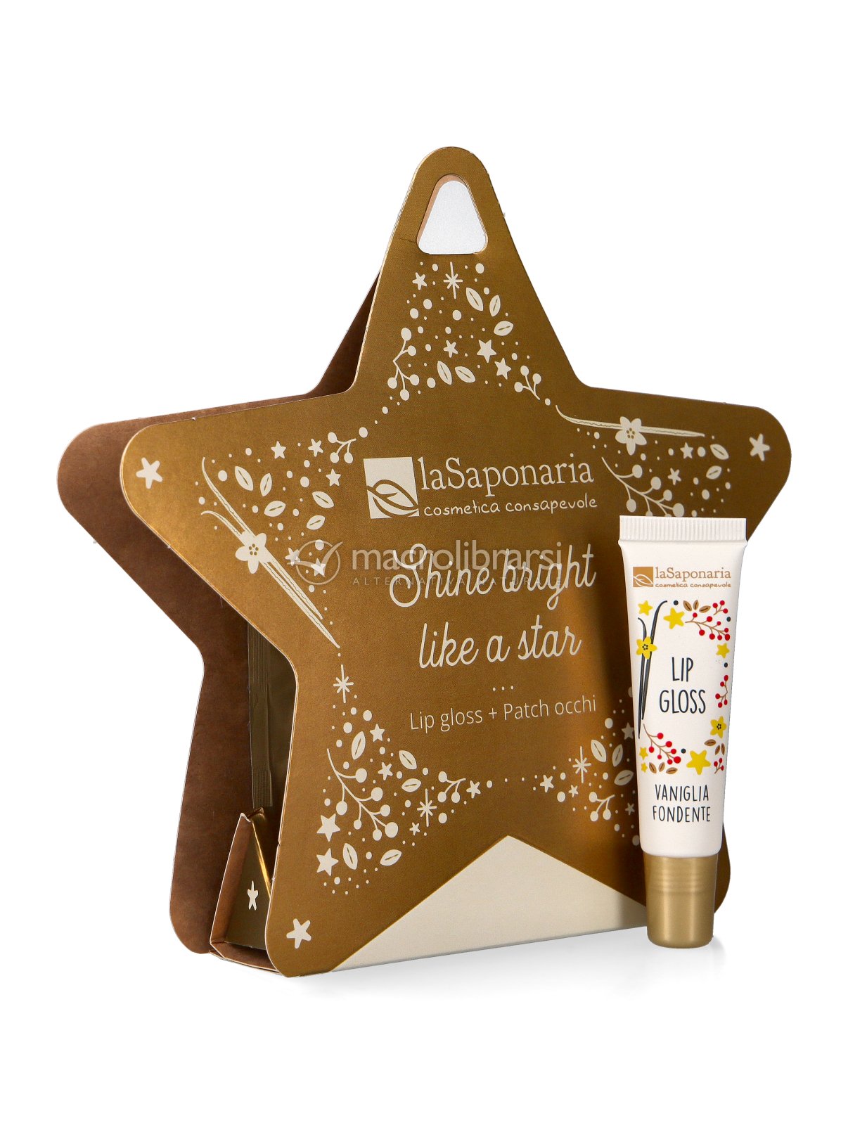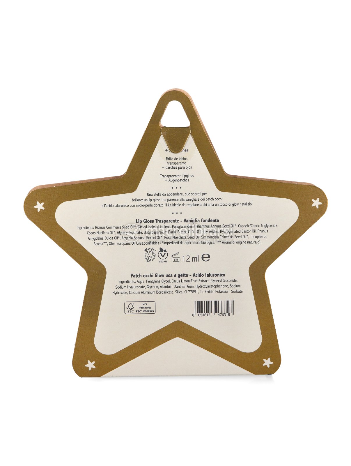 Un kit essenziale e scintillante: coccola lo sguardo con l’acido ialuronico, illumina le labbra con un gloss trasparente dal delicato aroma di vaniglia. La stella dorata si trasforma in una decorazione per l’albero, perfetta come pensiero di Natale.