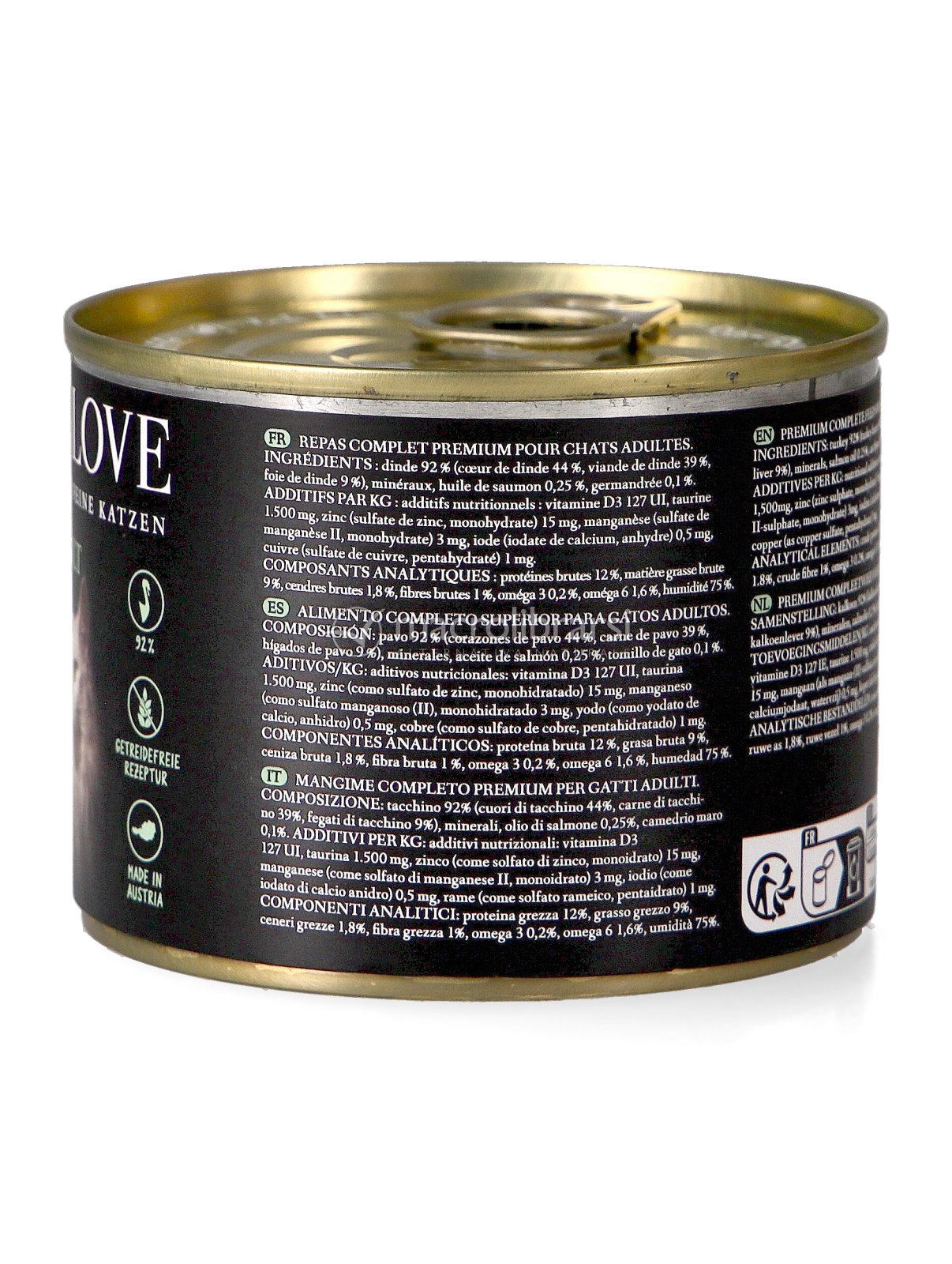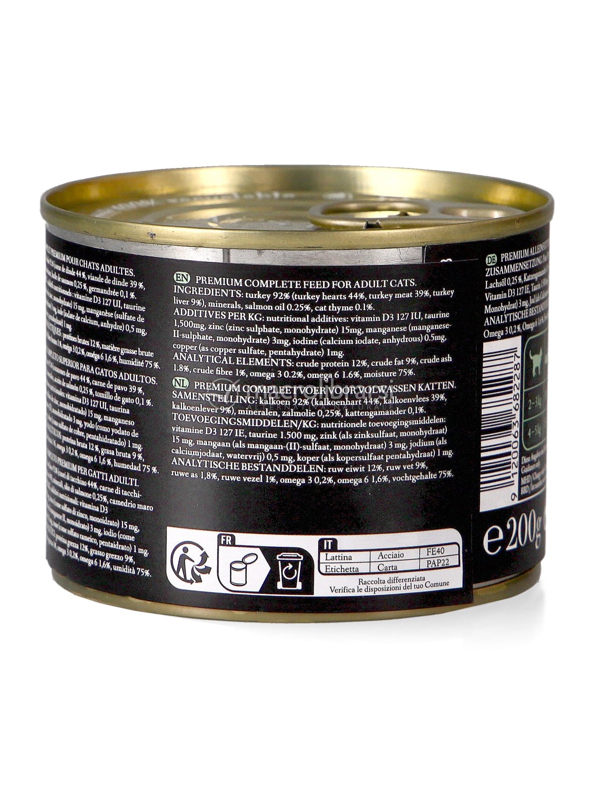 Tacchino 92% (cuori di tacchino 44%, carne di tacchino 39%, fegati di tacchino 9%), minerali, olio di salmone 0,25%, camedrio maro 0,1%.