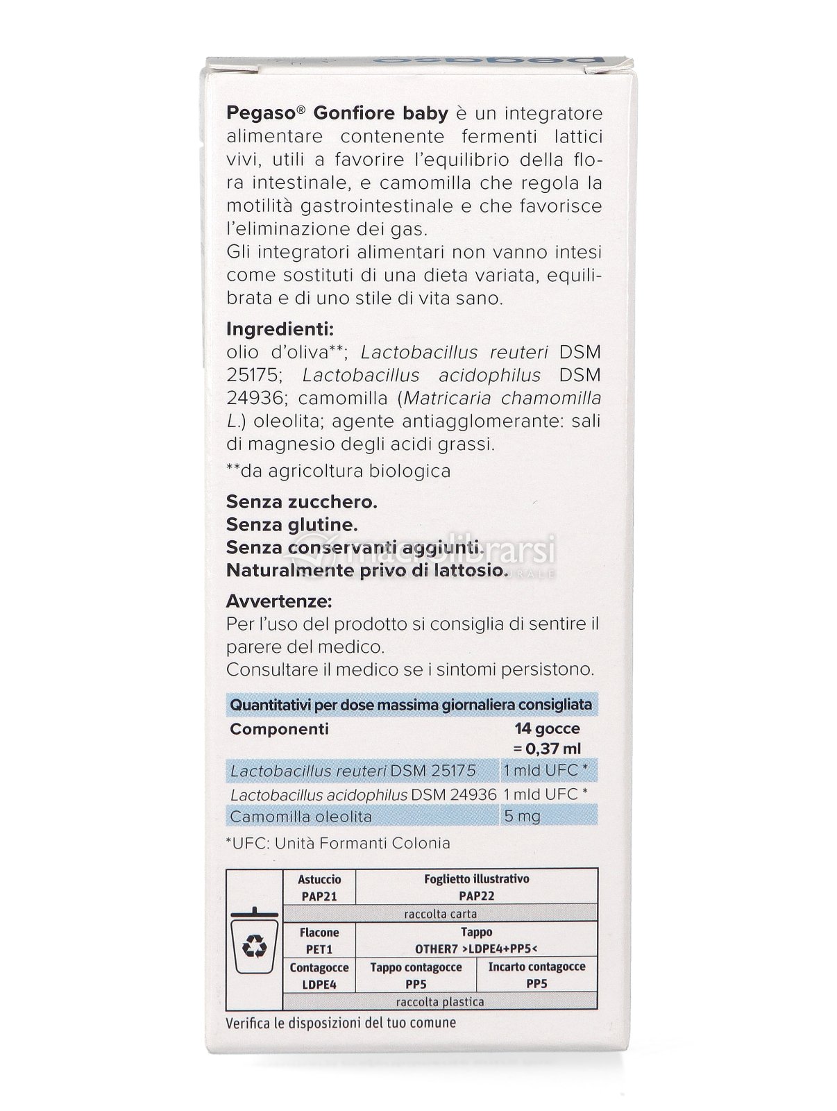| Disclaimer | Non superare la dose giornaliera consigliata. Gli integratori alimentari non vanno intesi come sostituti di una dieta variata ed equilibrata. Tenere fuori dalla portata dei bambini al di sotto dei tre anni. Non utilizzare in gravidanza e nei bambini o comunque per periodi prolungati senza sentire il parere del medico. Conservare in luogo asciutto e lontano da fonti di calore. Richiudere la confezione dopo l'uso. Macrolibrarsi ricorda l'importanza di seguire uno stile di vita sano e un'alimentazione variata ed equilibrata. |