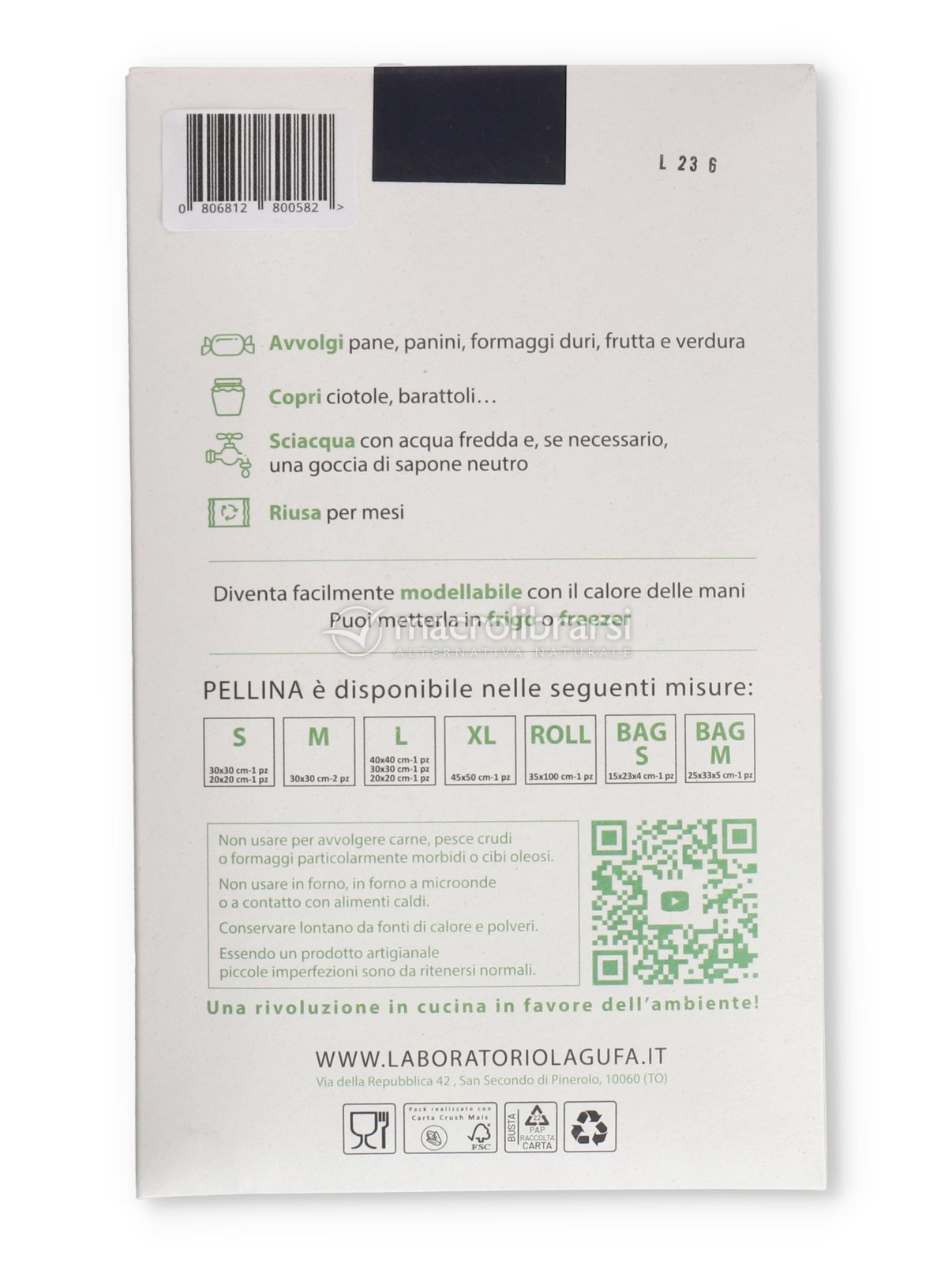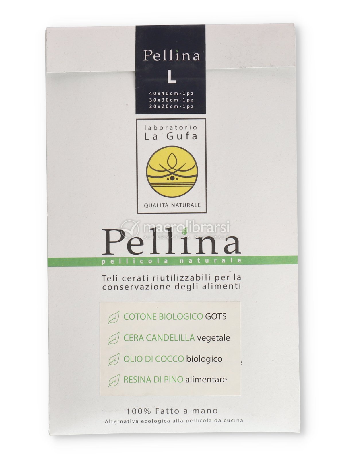 | Tessuto | Cotone biologico, cera d'api, olio evo, resina di pino. |
