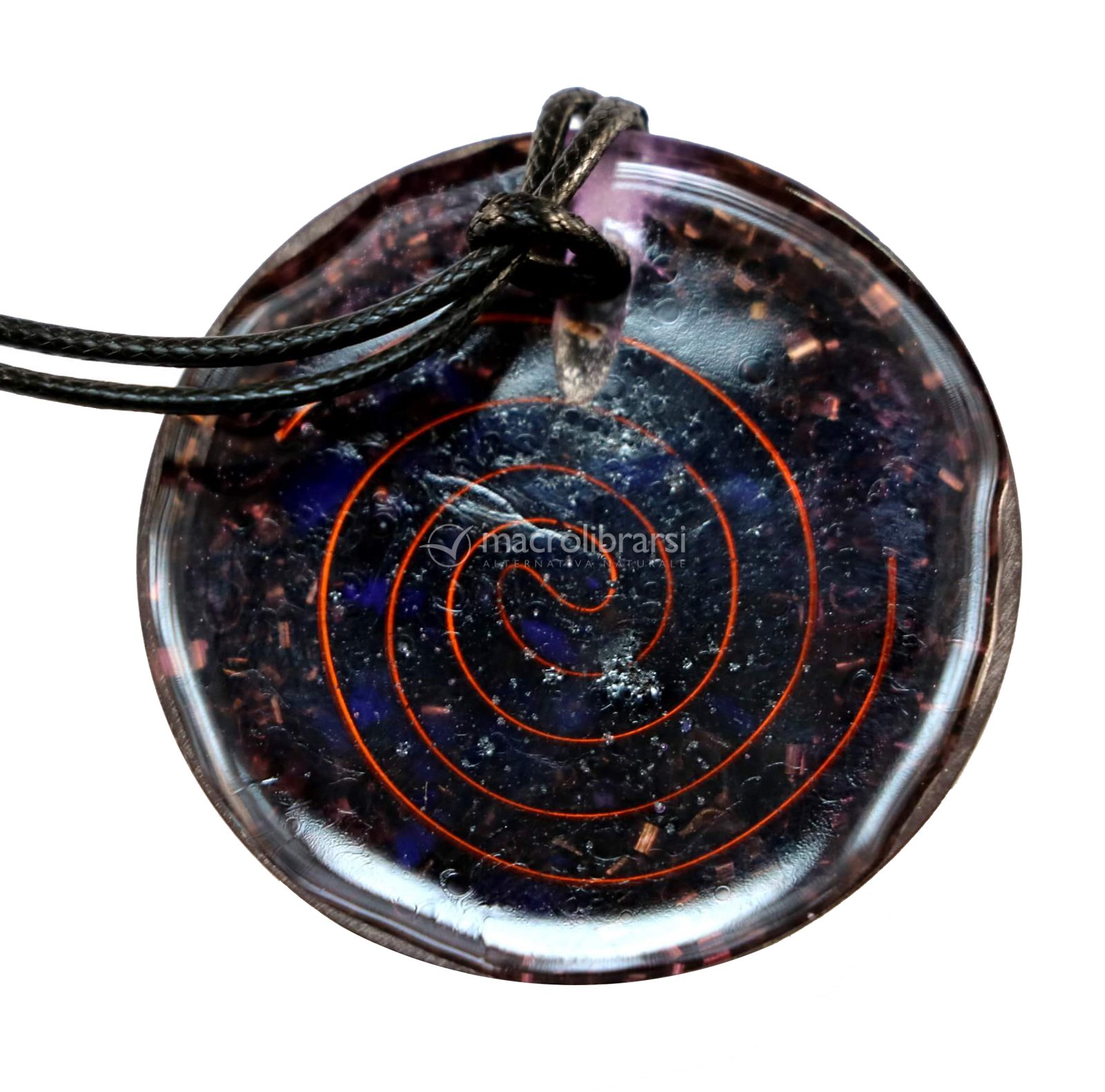 Nell'impasto orgonico, quindi OLTRE alla resina e al metallo, ci sono: tormalina nera, shungite èlite, quarzo rosa, quarzo bianco, ametista. Inoltre c'è una spirale in rame a due direzioni.