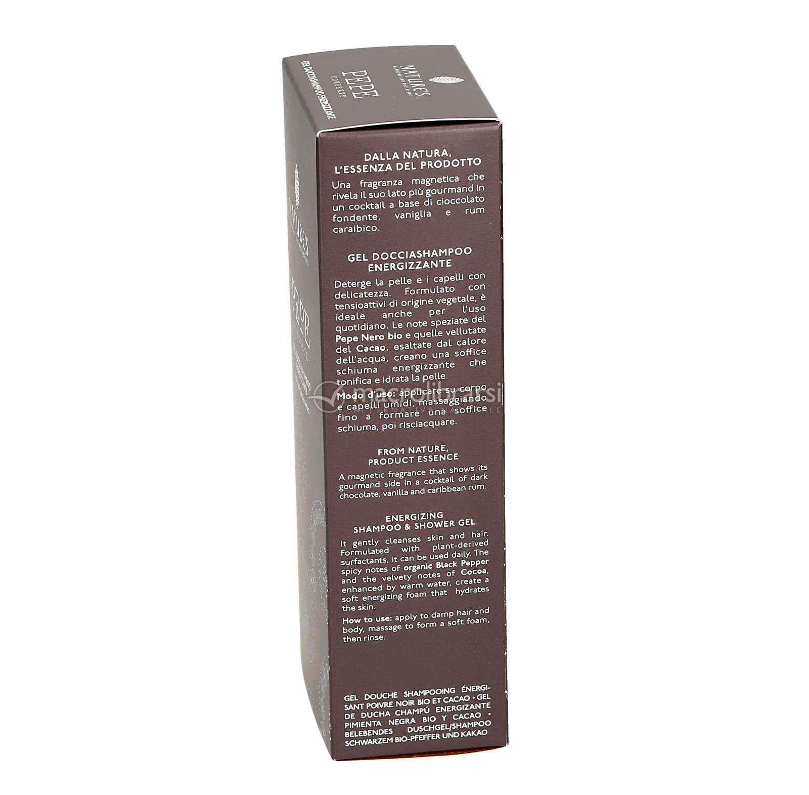 La caratteristica profumazione, al Pepe Nero e Cacao, regala un soffio di energizzante benessere.